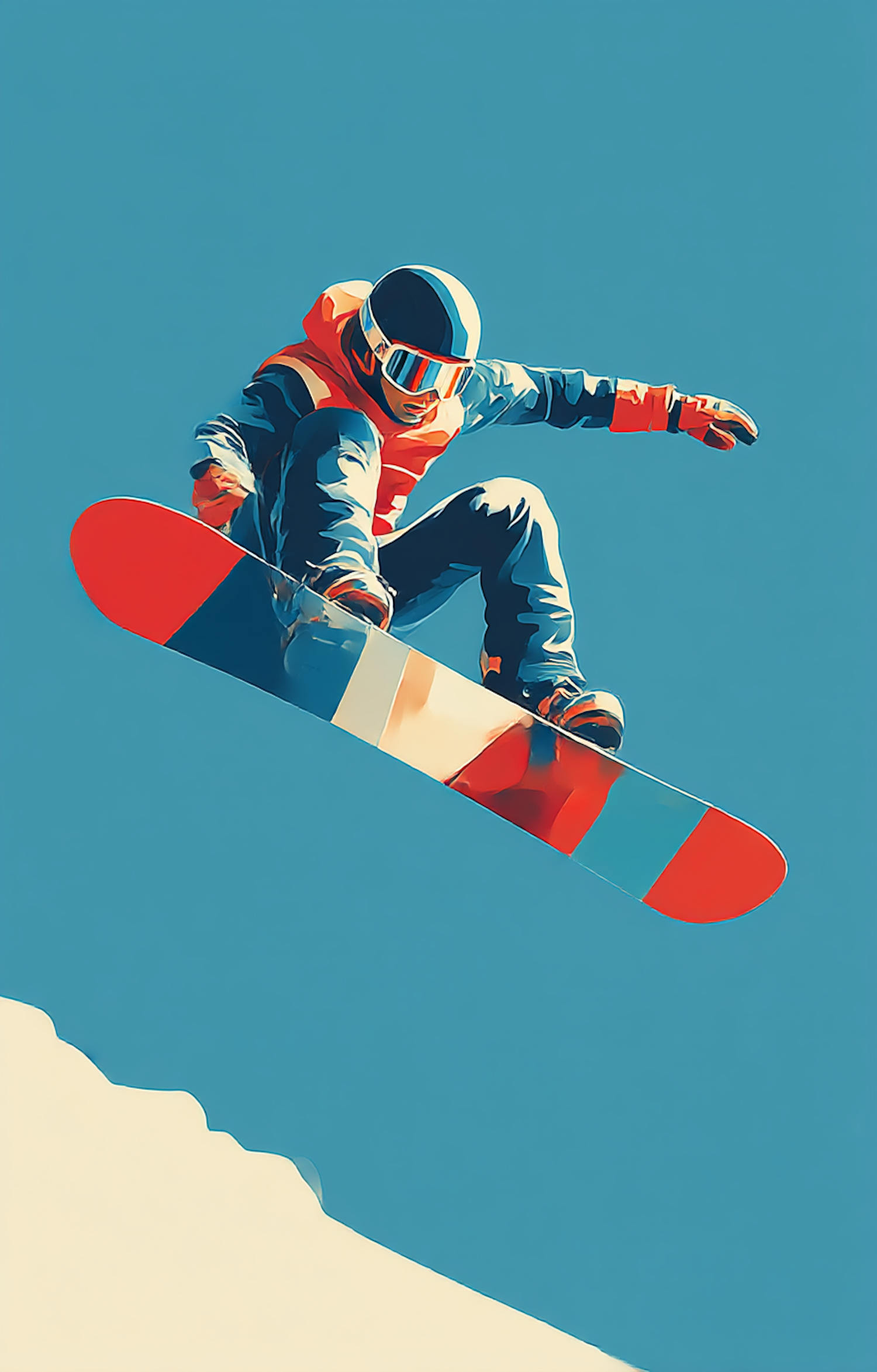 A snowboarder in vibrant gear performs a trick mid-air against a clear blue sky, showcasing skill and energy in a colorful scene.