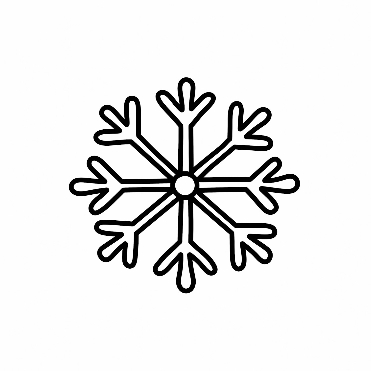 Minimalist black-and-white snowflake illustration with symmetrical branches, perfect for winter-themed designs or decorations.