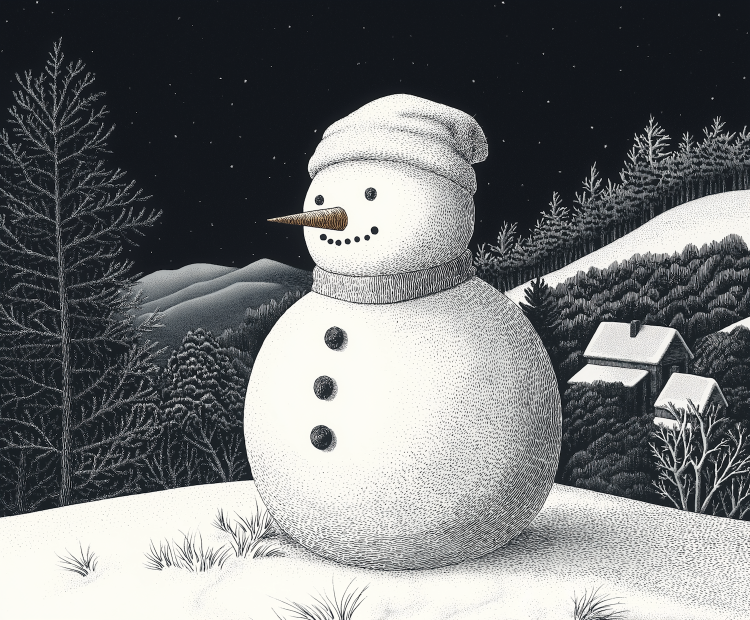 Charming snowman in a snowy landscape with a starry night sky, surrounded by hills and trees. Cozy winter scene illustration.