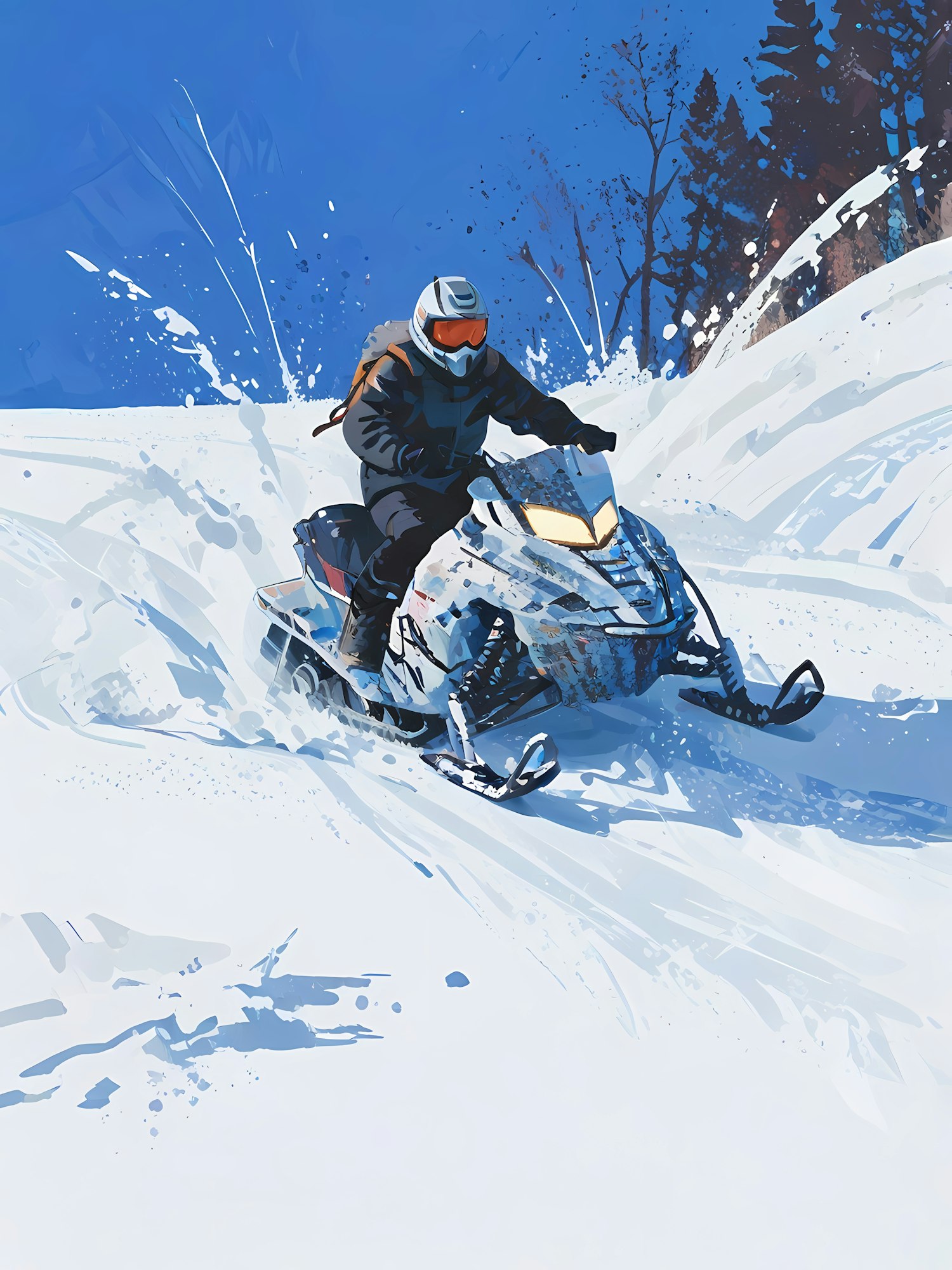 Illustration of a snowmobile rider speeding through snow, with dramatic snow spray and a vibrant blue sky in the background.