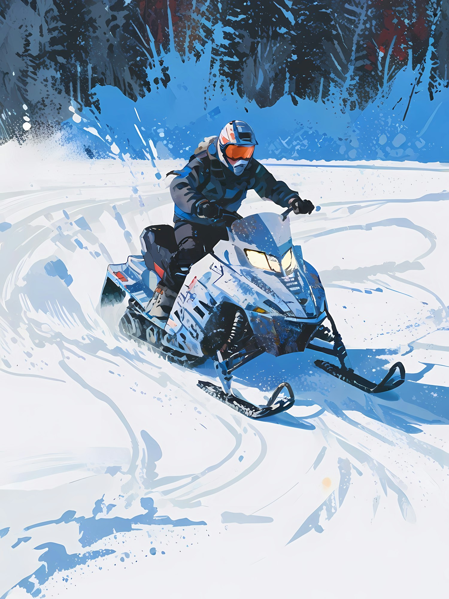 Illustration of a snowmobile rider carving through snow, wearing a blue suit and helmet, with a snowy forest backdrop. Winter adventure vibes!
