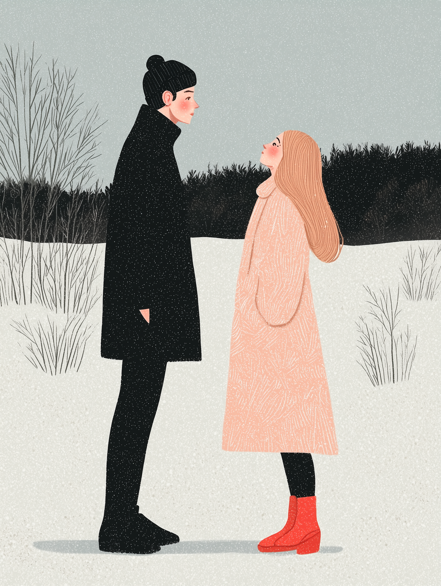 Two figures in winter coats stand facing each other in a snowy landscape, with a pop of red from the boots against a muted background.