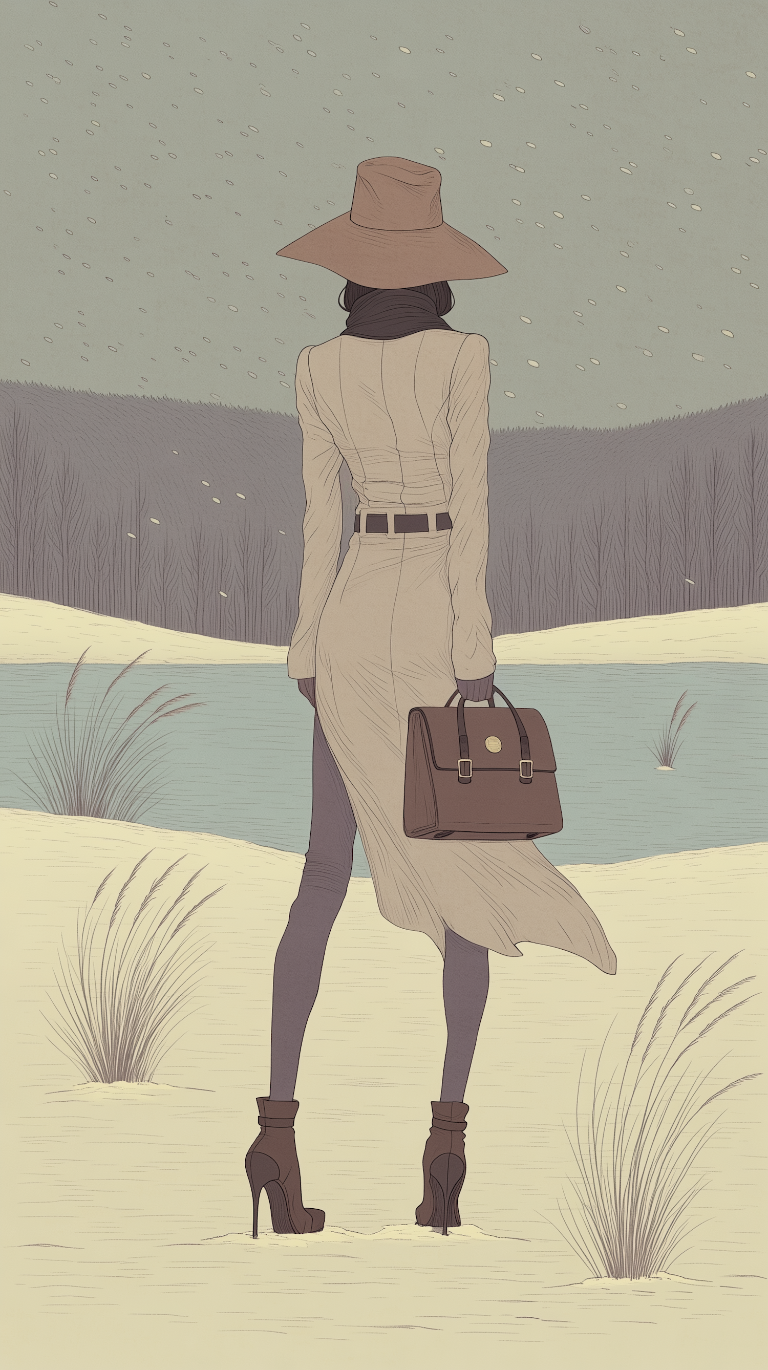 Stylized illustration of a person in a snowy landscape, wearing a beige coat and hat, holding a handbag, with a serene frozen lake in the background.