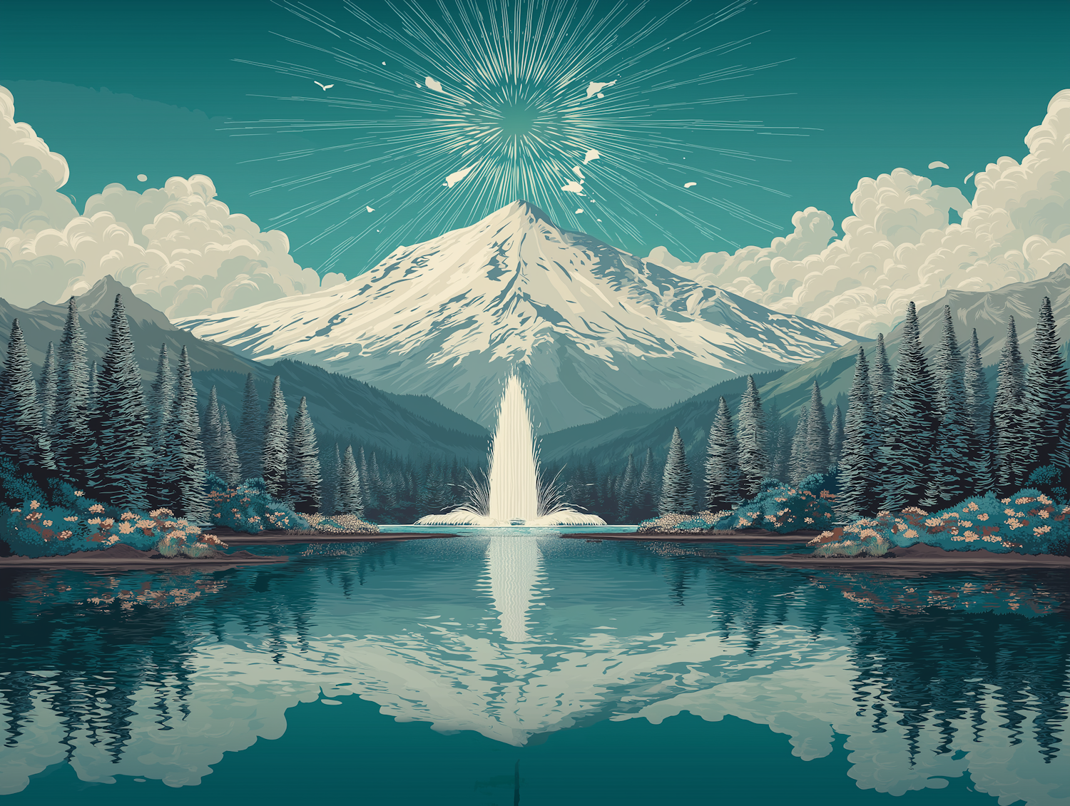 A scenic mountain vista with a reflecting lake with lakeshore geyser, surrounded by forest and vibrant flowers, under an artistic teal sky with sunbeams.