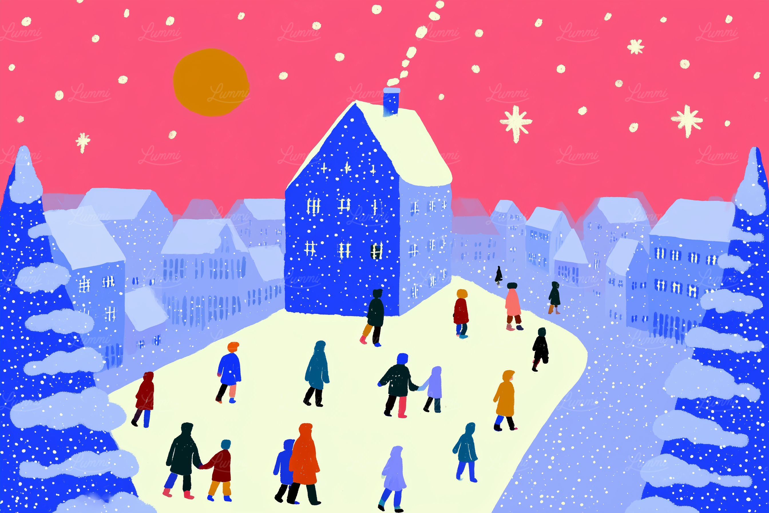 A colorful winter village scene with a blue house, pink sky, and people in vibrant clothing walking in the snow.