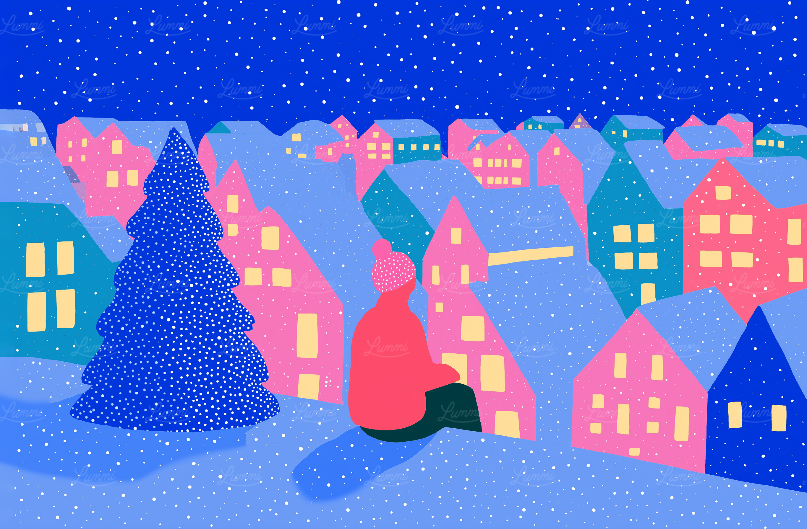 A colorful winter village scene with snow-covered houses, a large tree, and a figure in a red coat enjoying the view.