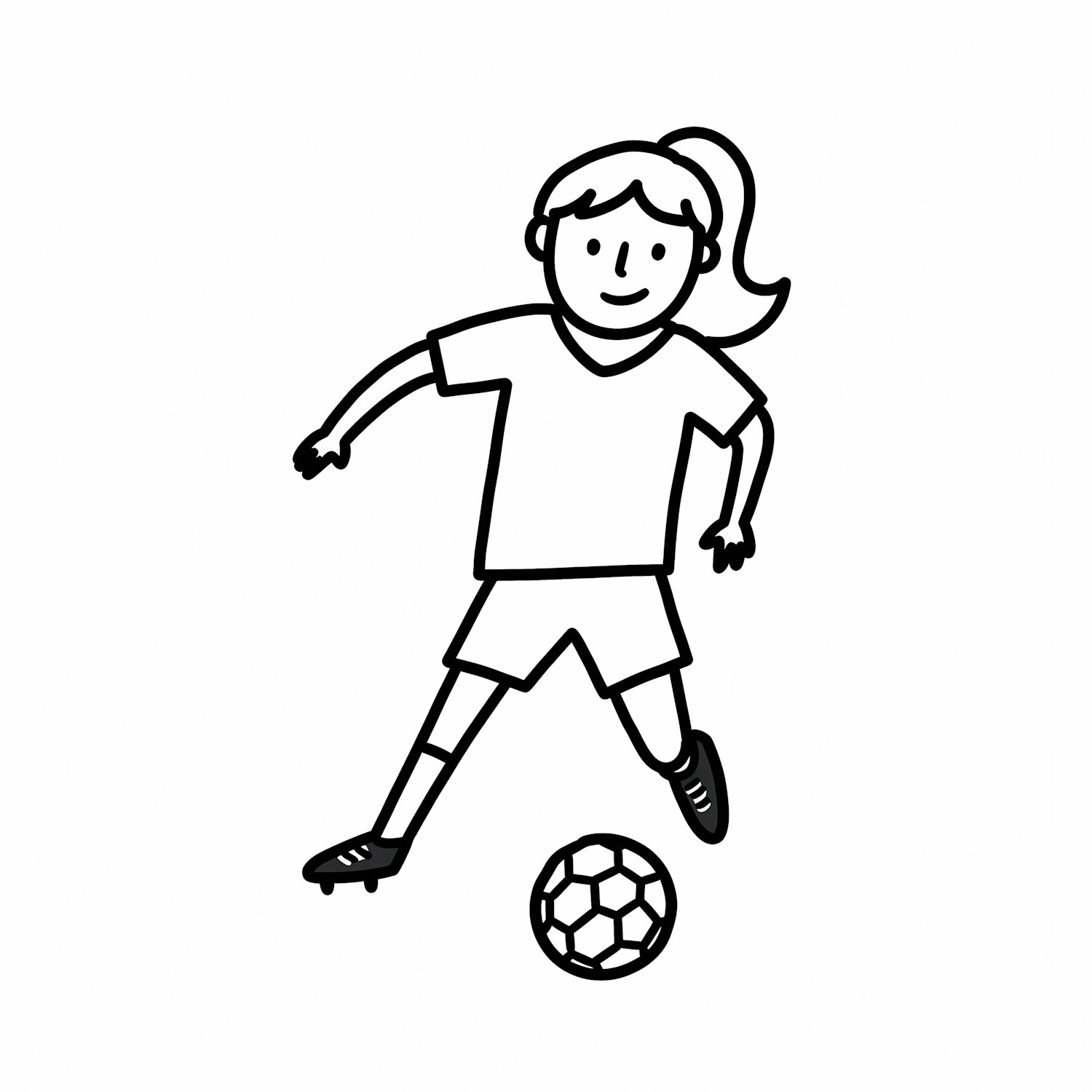 A simple black-and-white illustration of a girl playing soccer, wearing a sports outfit and kicking a ball with a dynamic pose.