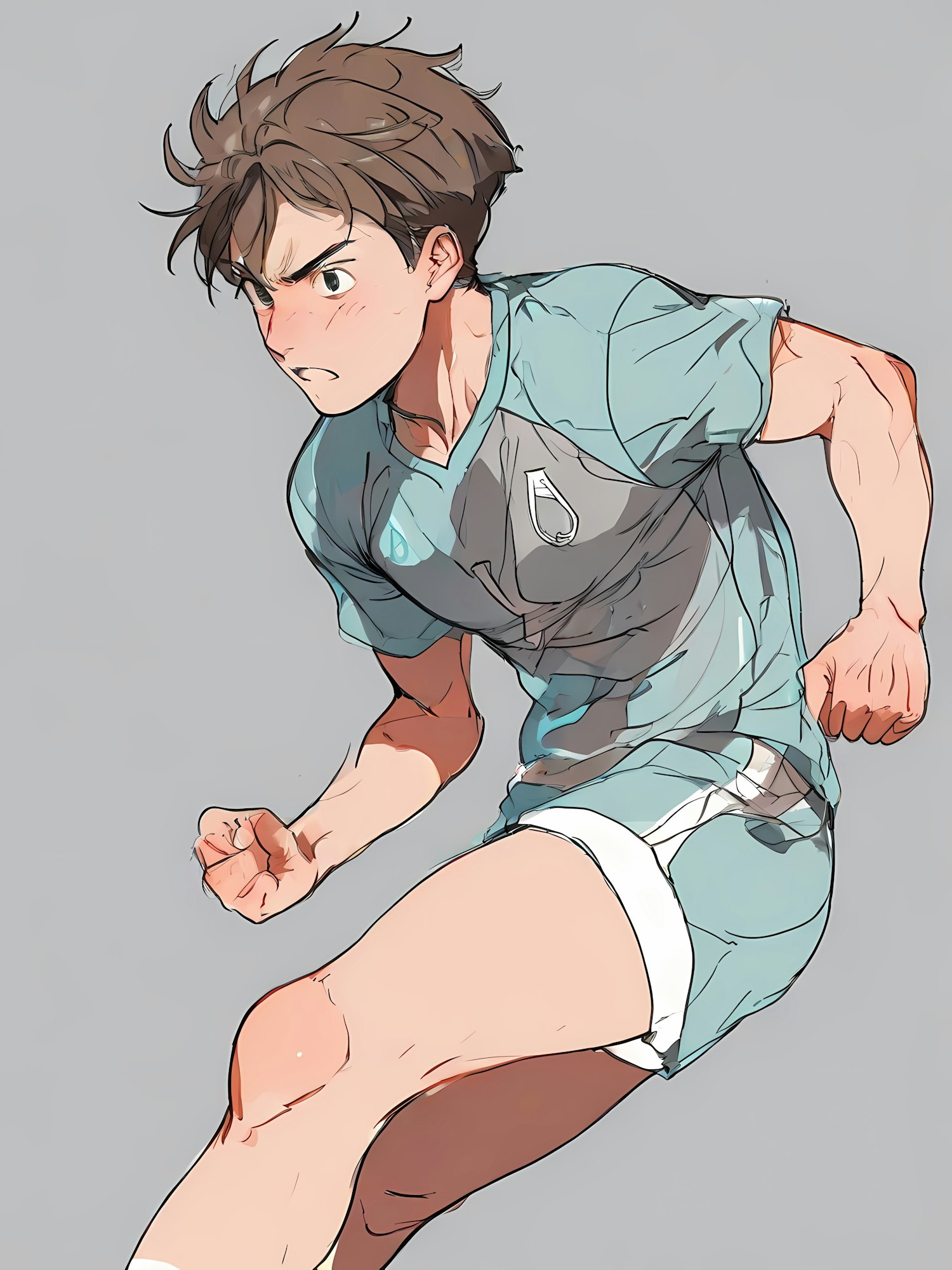 Energetic illustration of a young soccer player in a light blue uniform, mid-action with a determined expression and dynamic pose.