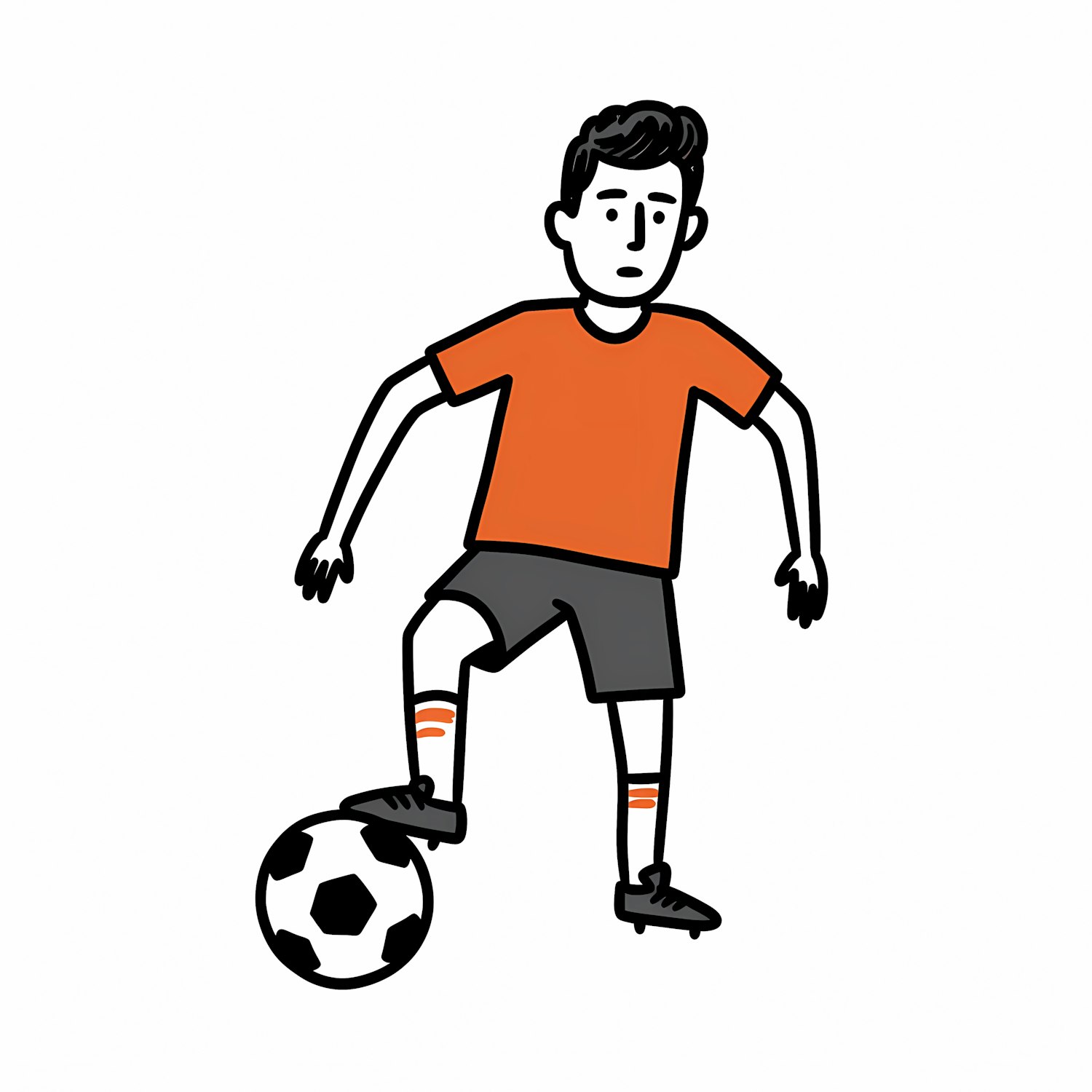 Cartoon illustration of a soccer player in an orange shirt and gray shorts, standing with one foot on a soccer ball.