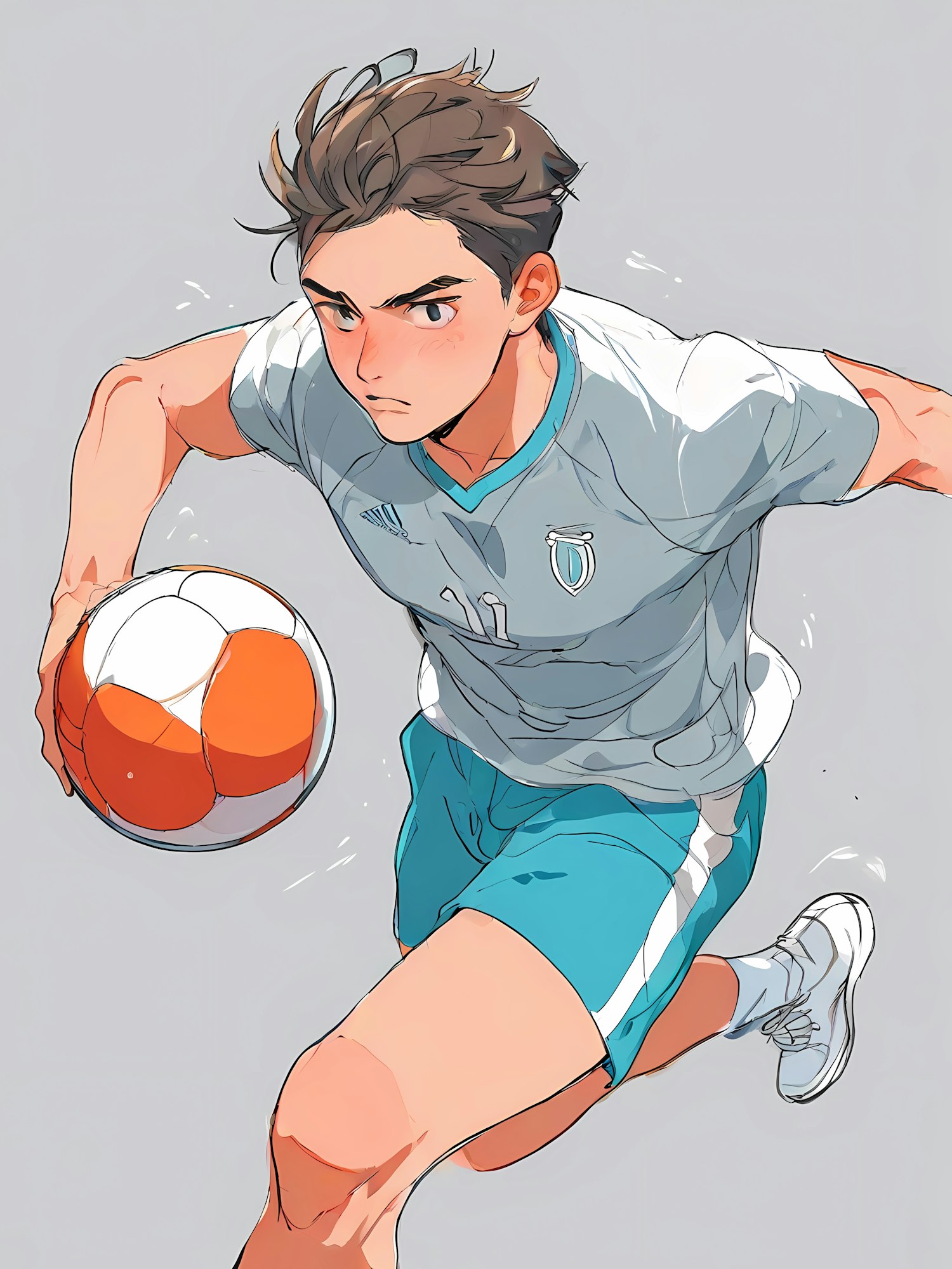 Energetic soccer player illustration with a light blue jersey, teal shorts, and an orange ball, showcasing dynamic motion and determination.