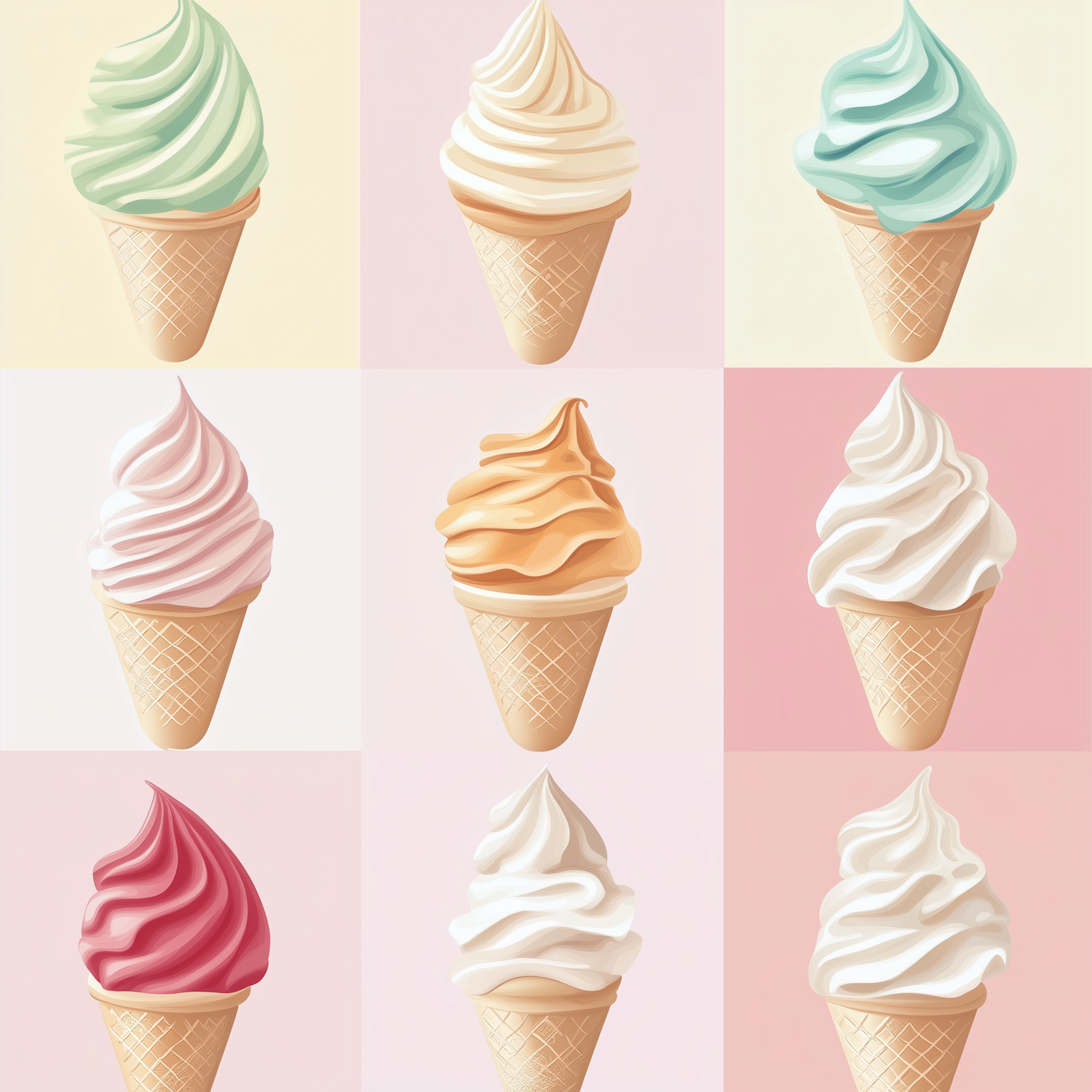 A colorful grid of nine soft-serve ice cream cones in pastel backgrounds, showcasing a variety of flavors and swirled designs.