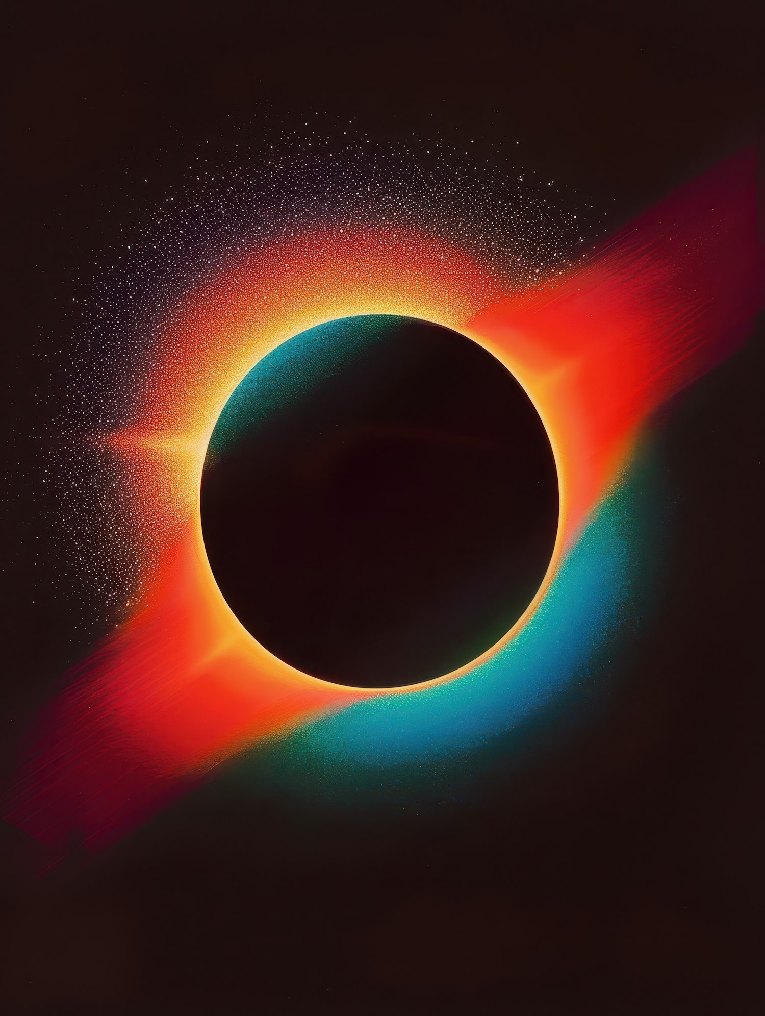 Abstract solar eclipse illustration with vibrant red, orange, blue, and green halo against a dark background.