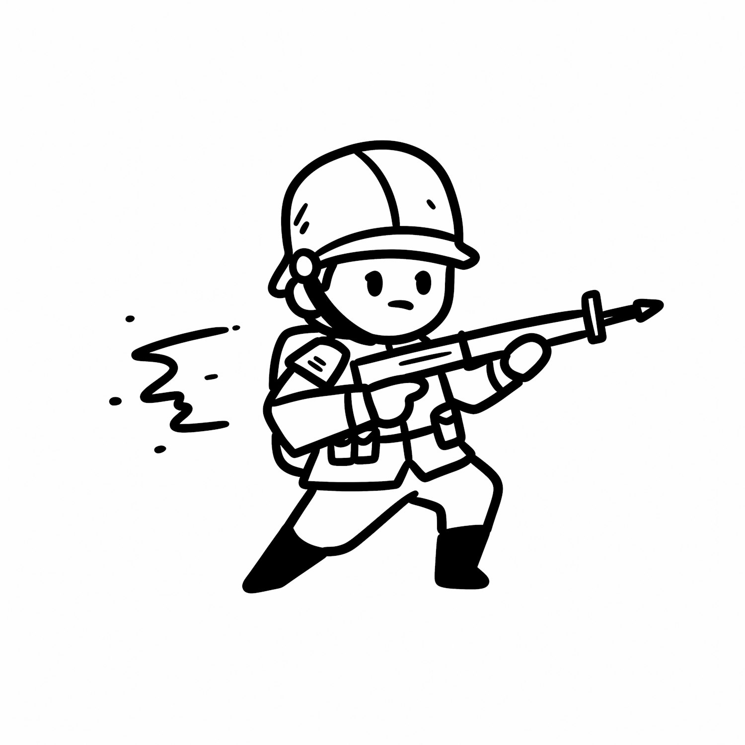 Cartoon illustration of a soldier in uniform holding a rifle with a bayonet, drawn in a clean black-and-white style.