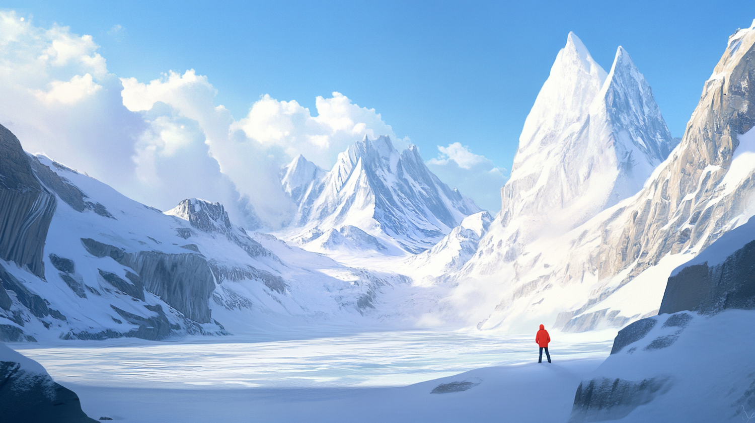 Majestic snowy mountains under a clear blue sky with a lone figure in a red jacket, creating a striking contrast in the serene landscape.