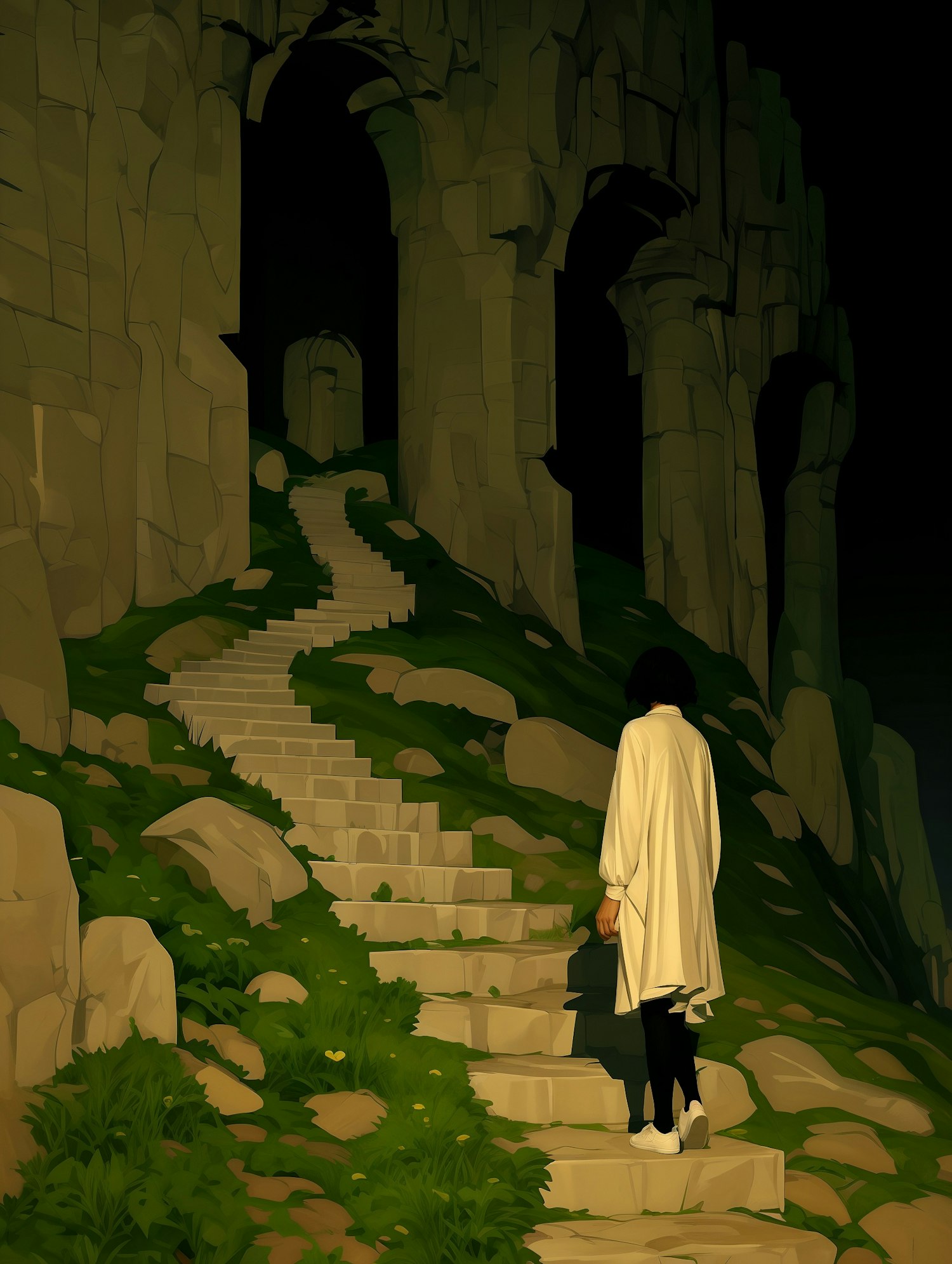 A person in a white coat ascends a stone staircase through lush greenery and ancient stone arches, creating a mystical atmosphere.