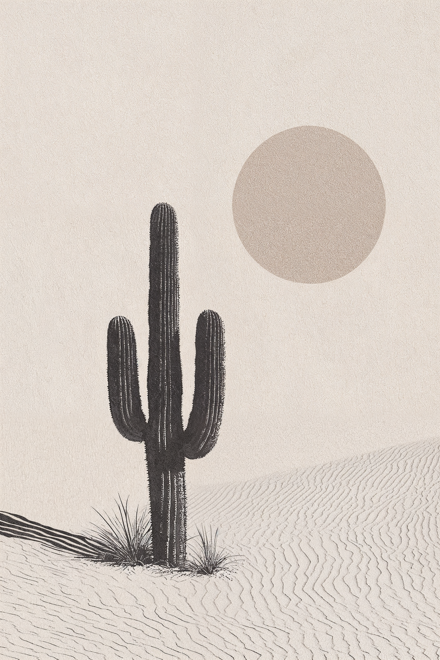 Minimalist desert illustration with a saguaro cactus, rippled sand dunes, and a muted sun in a serene, monochromatic palette.