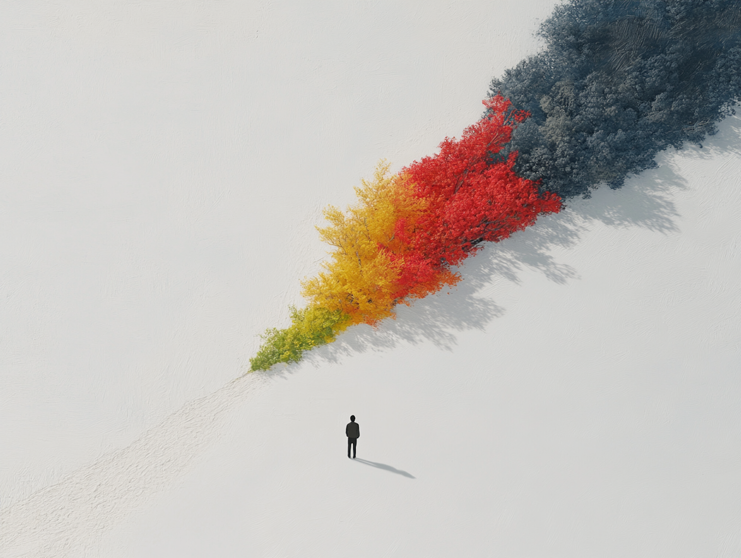A lone figure stands on snow, facing a gradient of colorful trees from green to dark blue, creating a striking contrast.