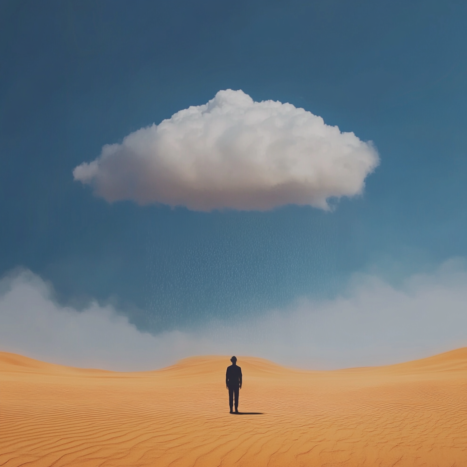 A lone figure stands in a vast desert under a single cloud, creating a surreal scene of isolation and wonder.