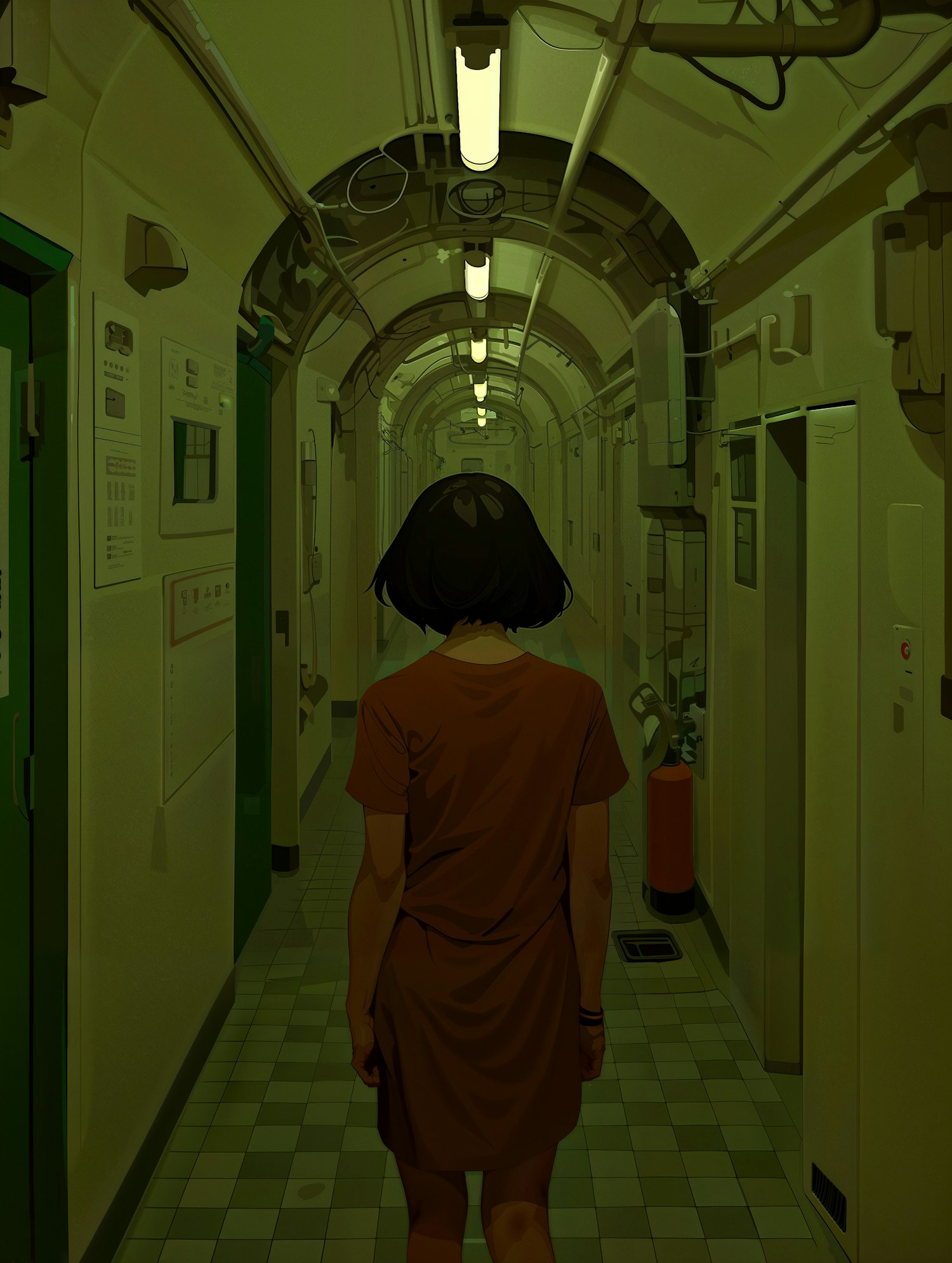 A lone figure in a brown dress stands in a dimly lit, industrial corridor with greenish lighting, evoking a sense of solitude.
