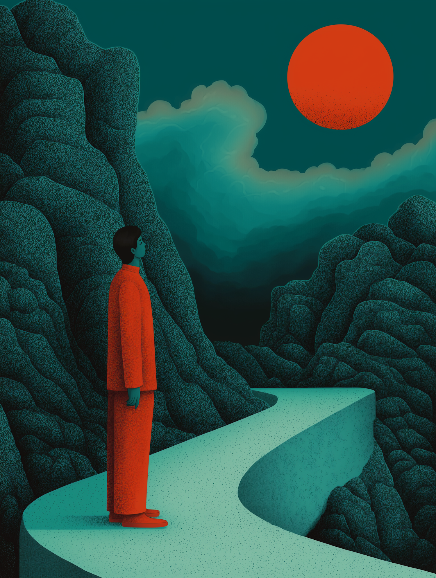 Surreal illustration of a person in red on a winding path, gazing at a red sun against a teal mountainous landscape.