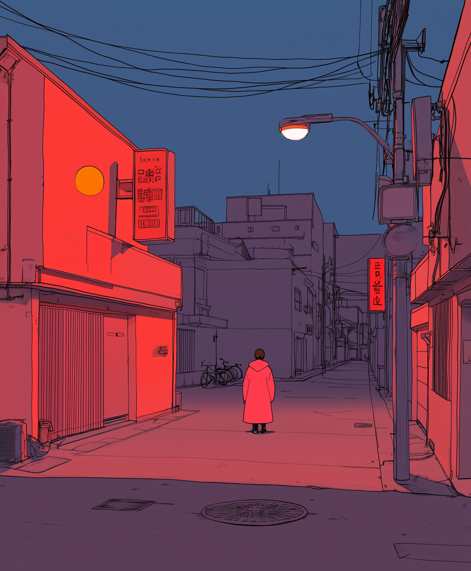 Stylized urban night scene with red neon lights, a lone figure in a pink coat, and a serene, mysterious atmosphere.