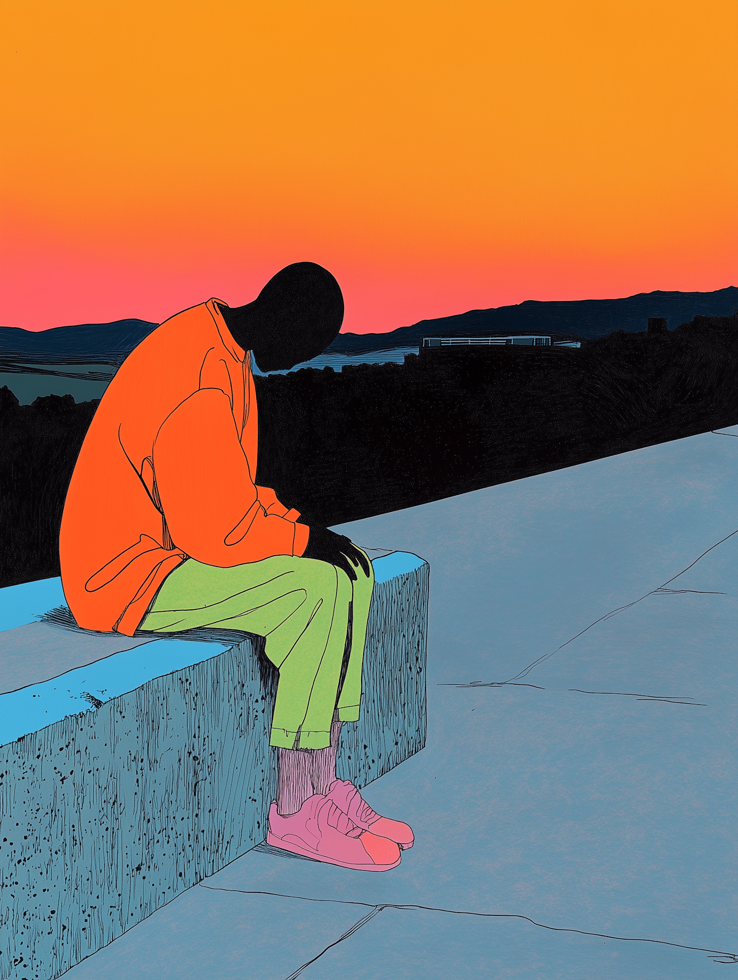 Stylized illustration of a person in bright clothing sitting against a vibrant sunset, creating a contemplative and colorful scene.