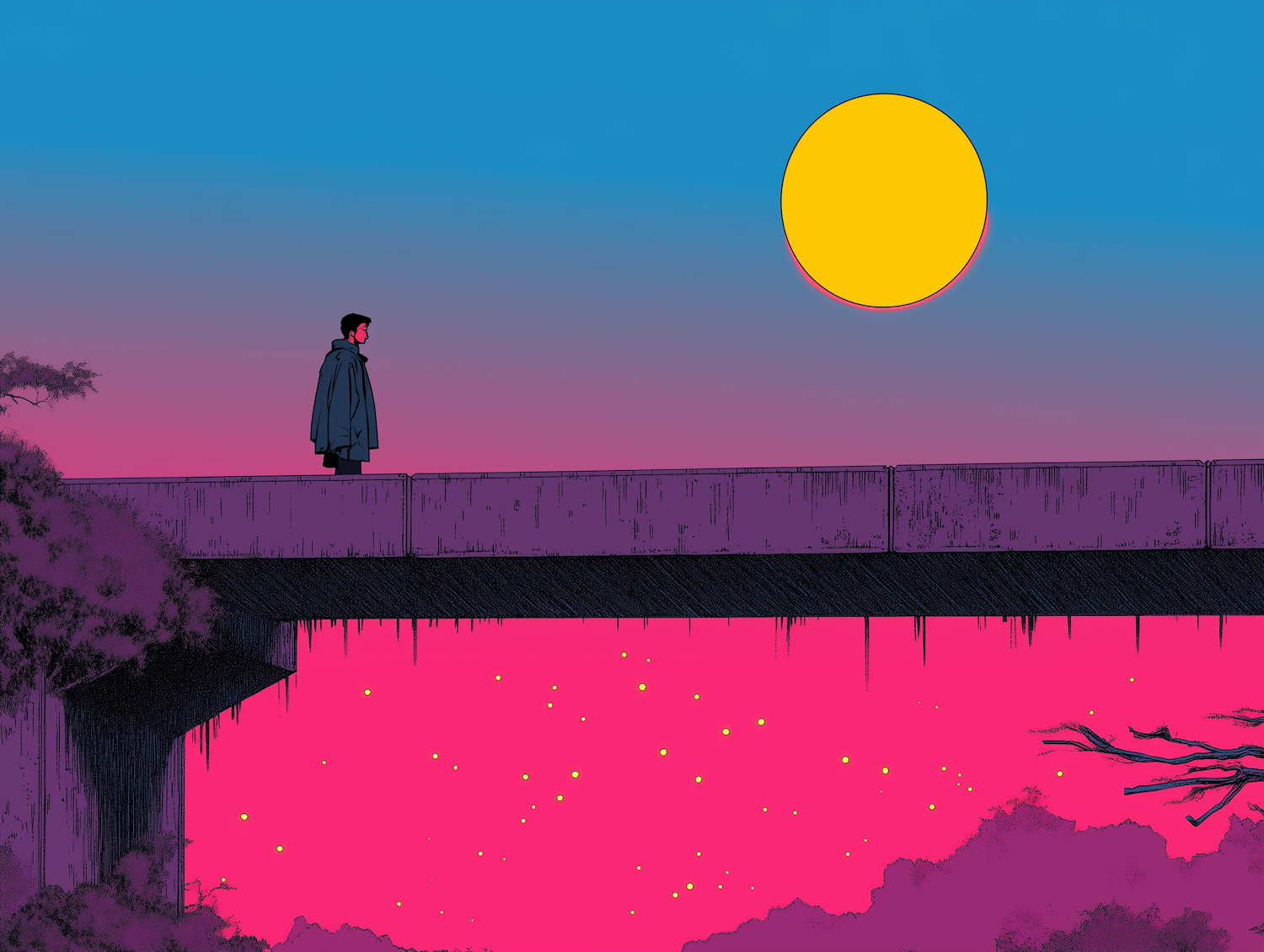 A mysterious figure on a bridge under a vibrant sky with a large yellow sun and glowing pink horizon, creating a surreal atmosphere.
