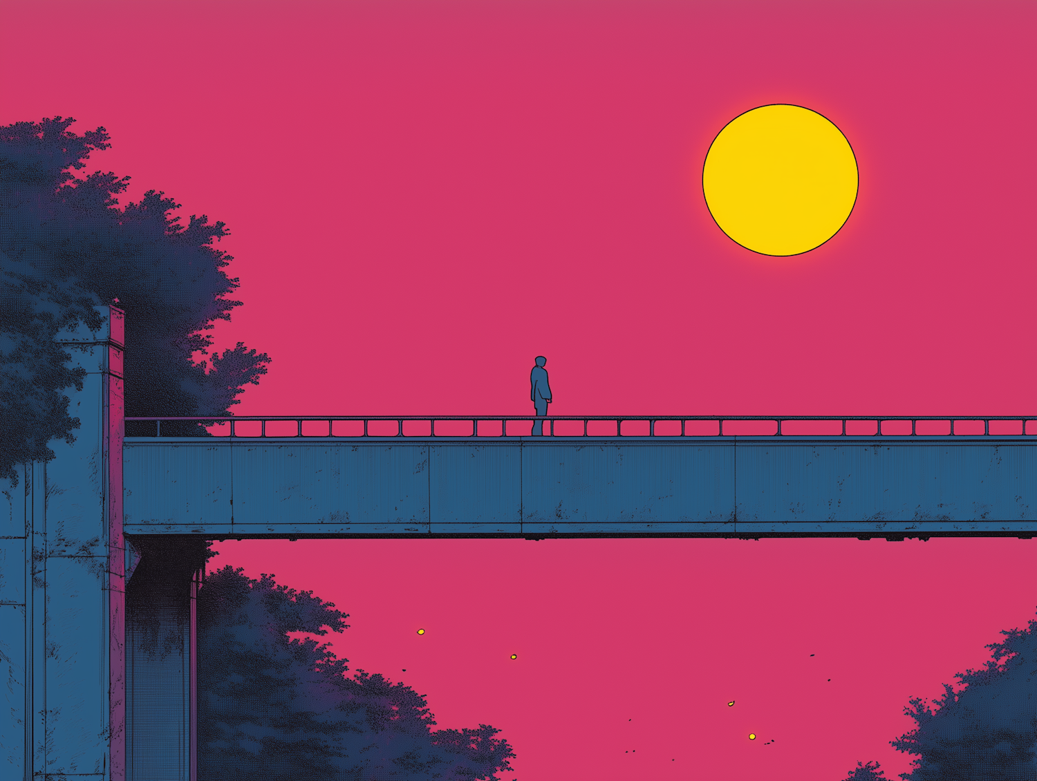 A lone figure on a blue bridge against a vivid pink sky with a bright yellow sun, surrounded by dark foliage.