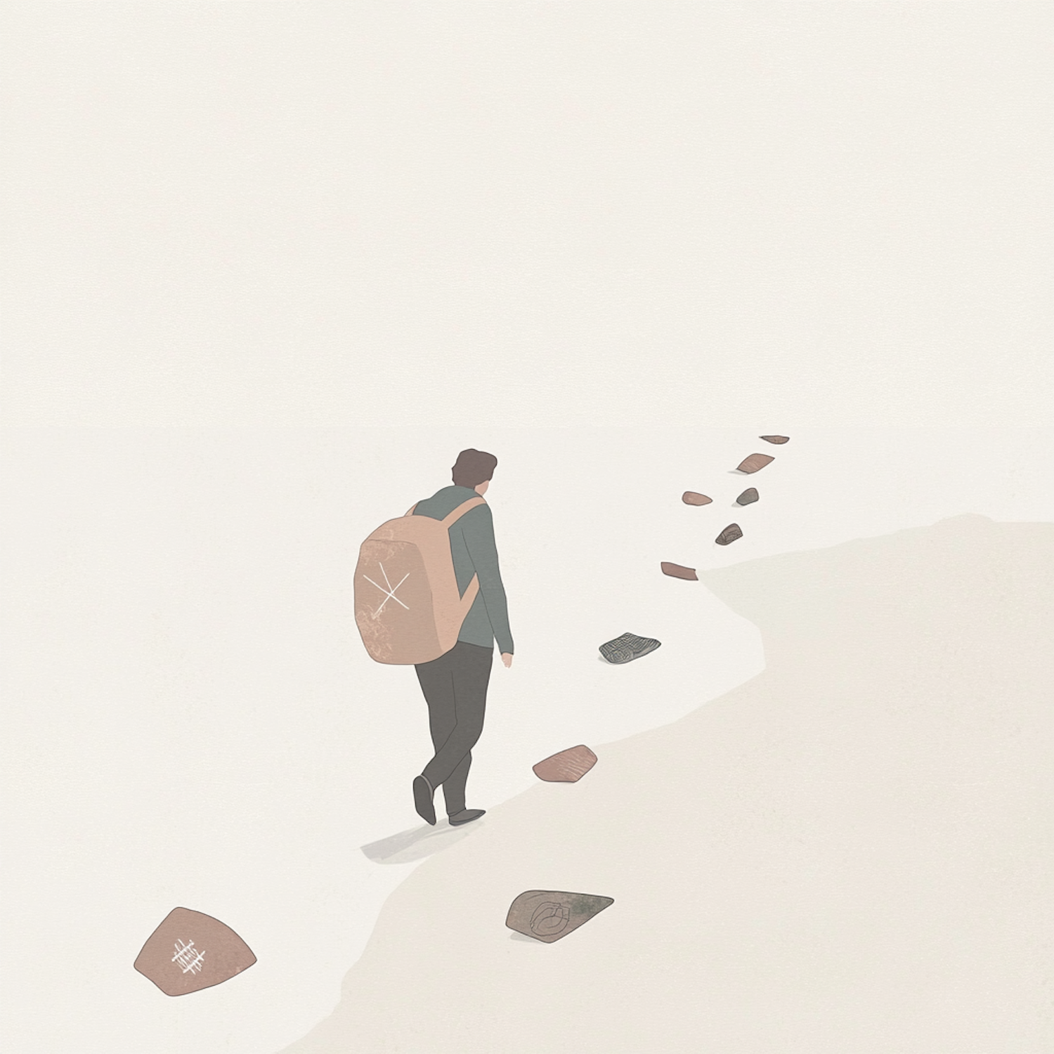 Minimalist illustration of a person with a backpack walking along a stone path, symbolizing a journey or exploration.