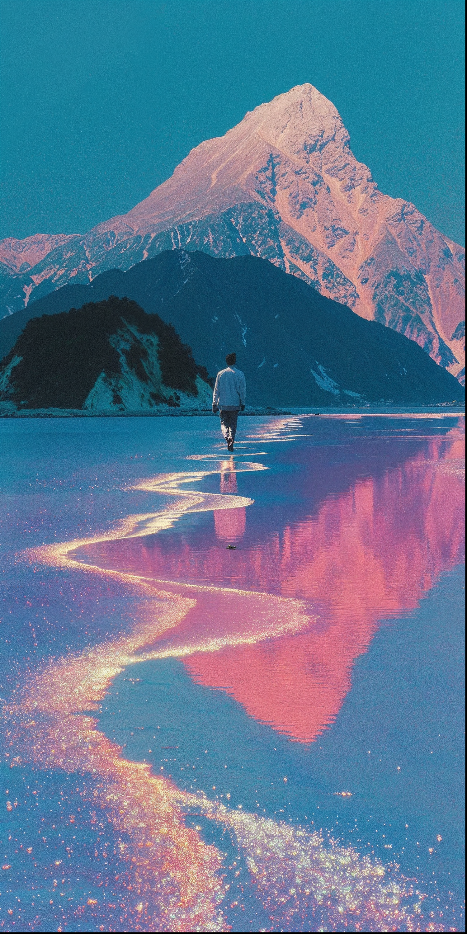 A person walks on a shimmering path with a majestic mountain backdrop, creating a surreal and dreamlike landscape.
