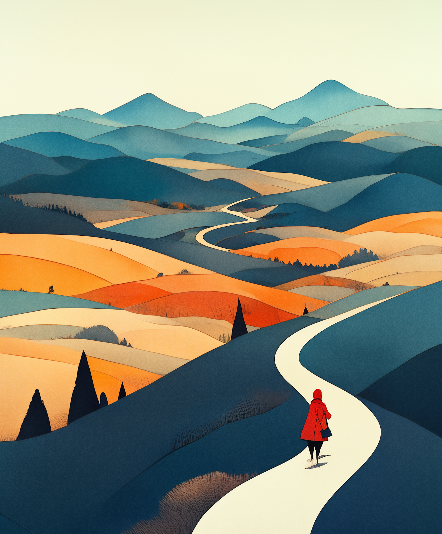 Stylized landscape with a person in a red coat on a winding path through colorful hills. Dreamlike and serene atmosphere.