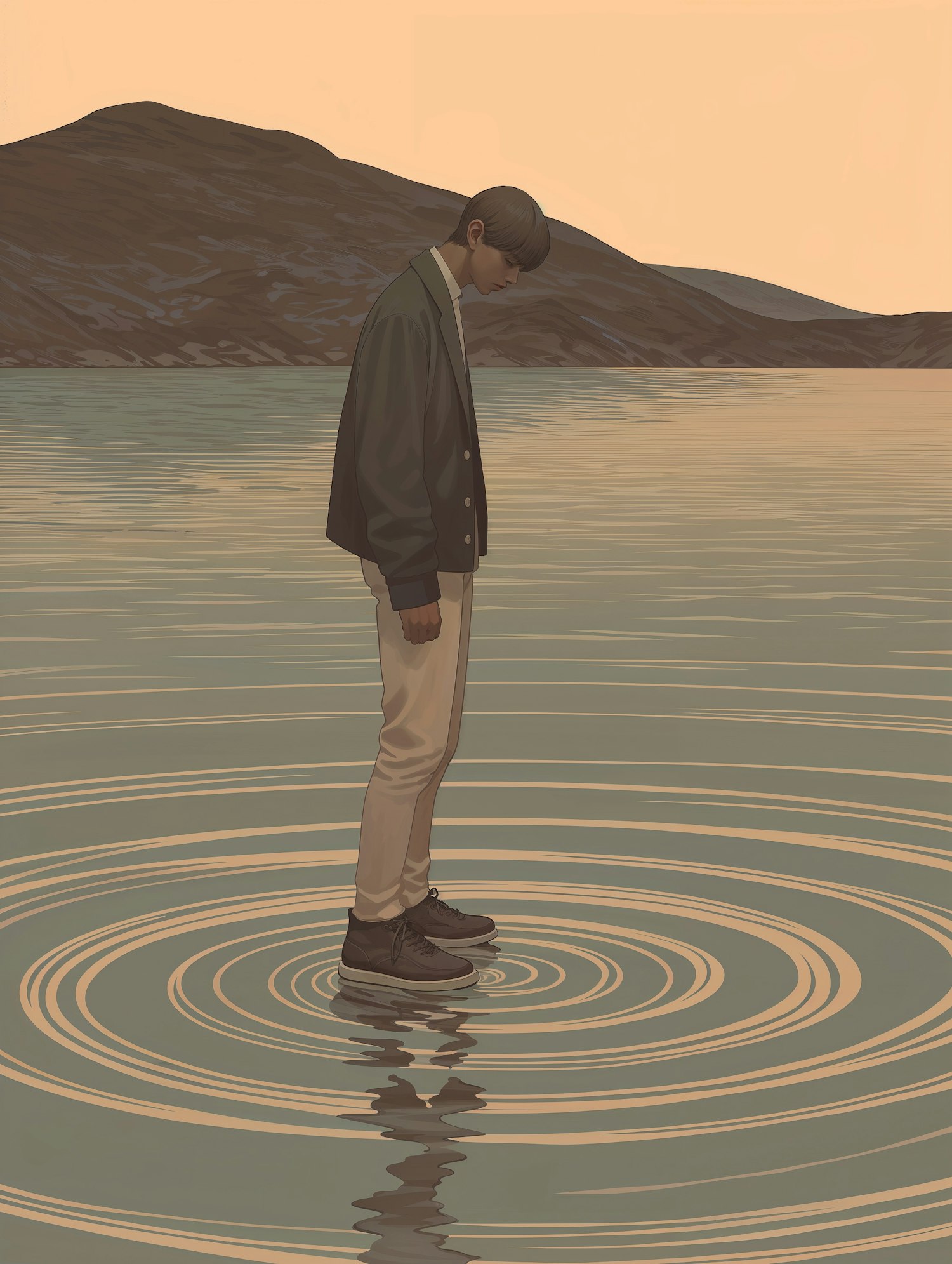 A contemplative young man stands on water, creating ripples, against a serene landscape with a pastel sky. Muted colors enhance tranquility.
