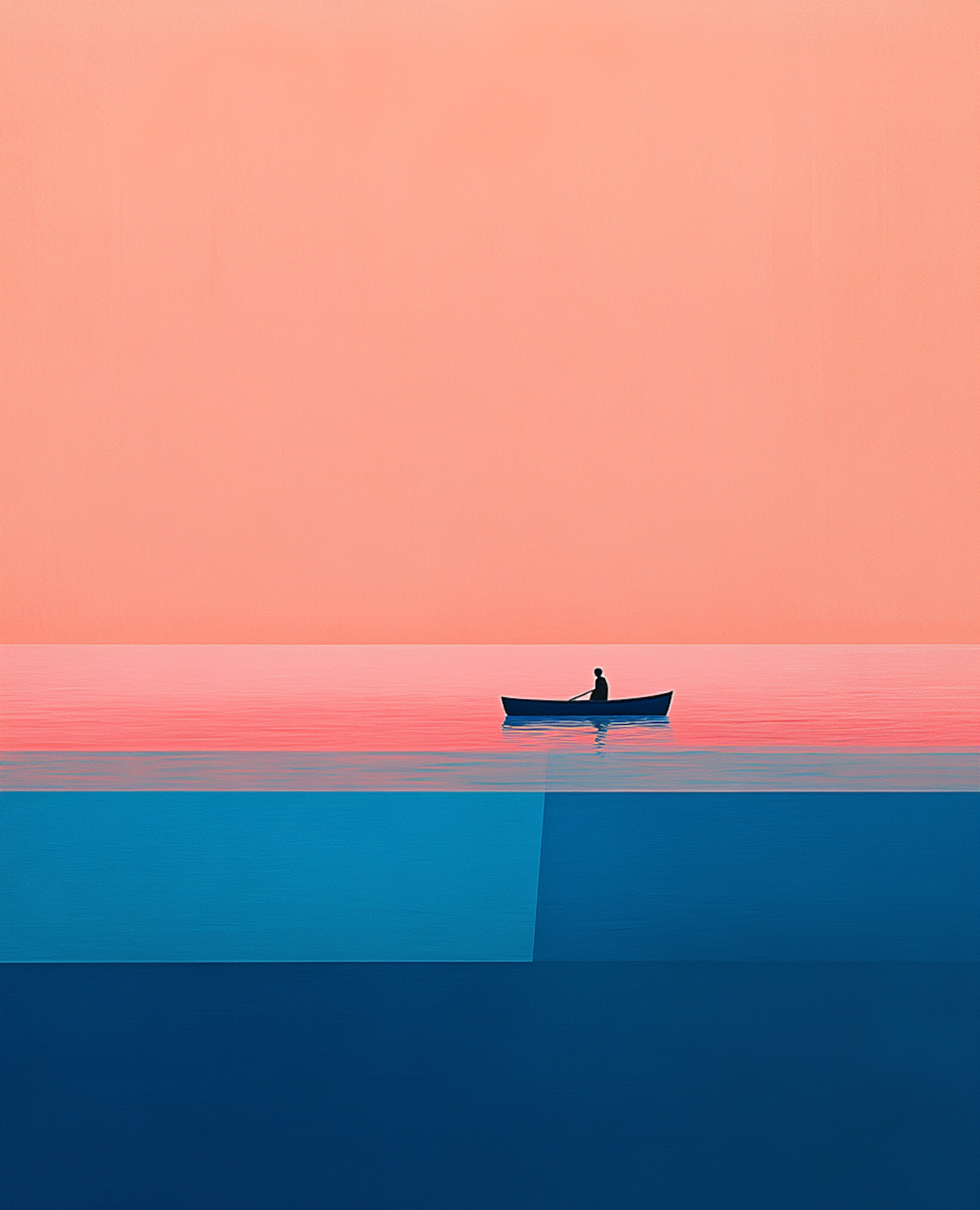 Minimalist illustration of a lone figure in a boat on calm water, with a peach sky and blue water creating a serene atmosphere.
