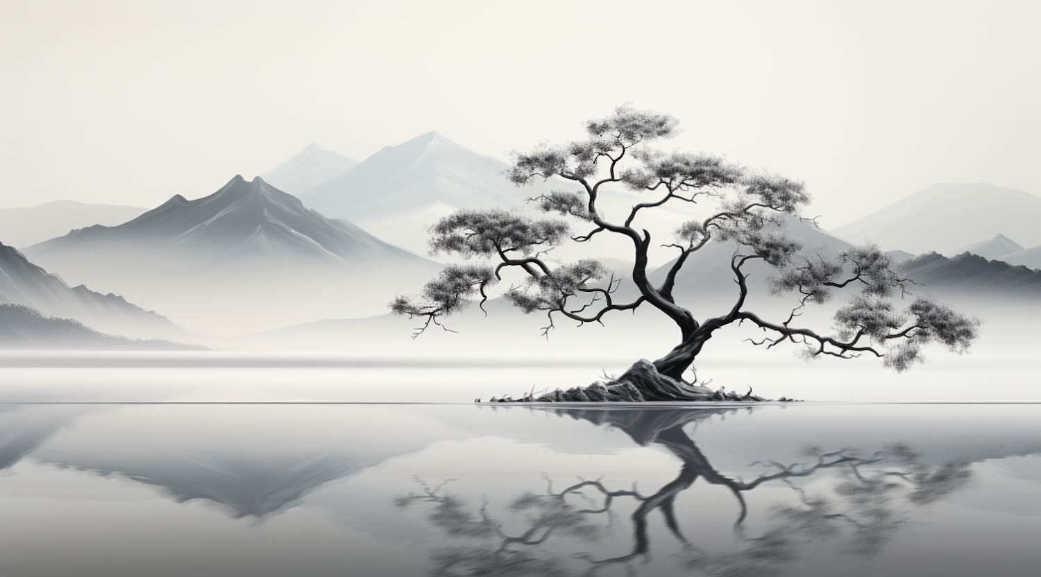 Monochromatic landscape with a solitary tree reflected in calm water, set against misty mountains. Tranquil and ethereal scene.