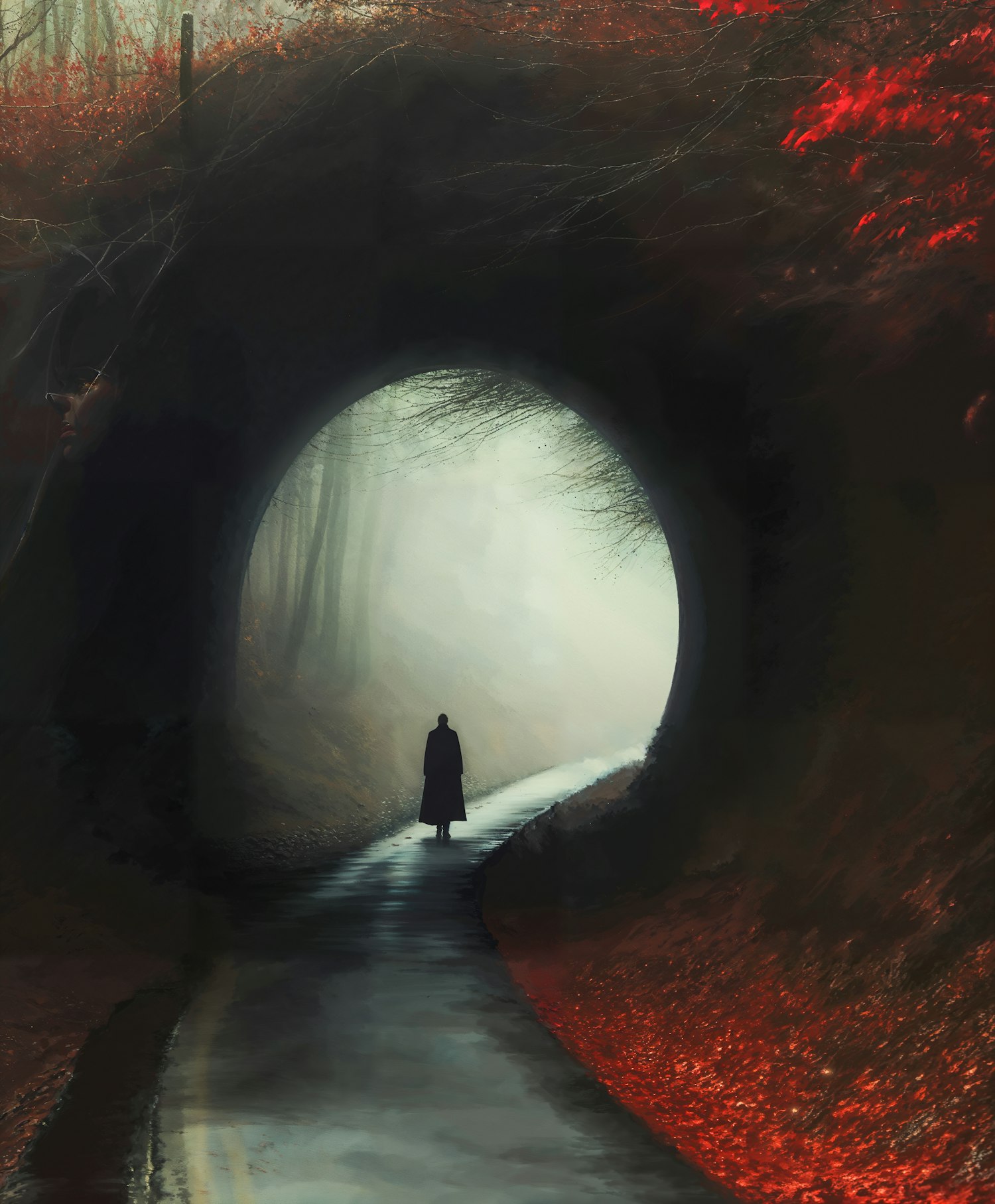 A mysterious figure walks through a misty tunnel, surrounded by autumn foliage and fog, creating an atmospheric and introspective scene.