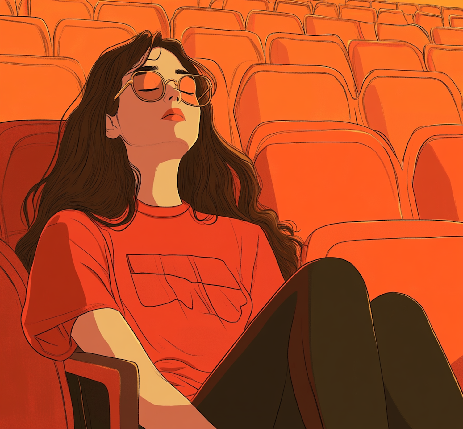 Illustration of a woman relaxing in an empty theater with orange seats, wearing a red shirt and sunglasses.
