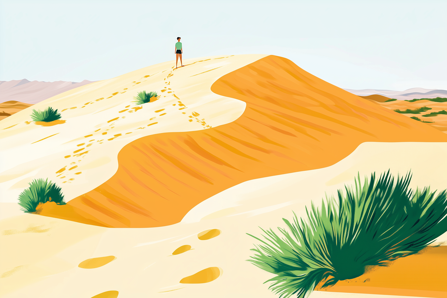A lone figure stands on a sand dune under a clear blue sky, surrounded by sparse green shrubs and golden sand.