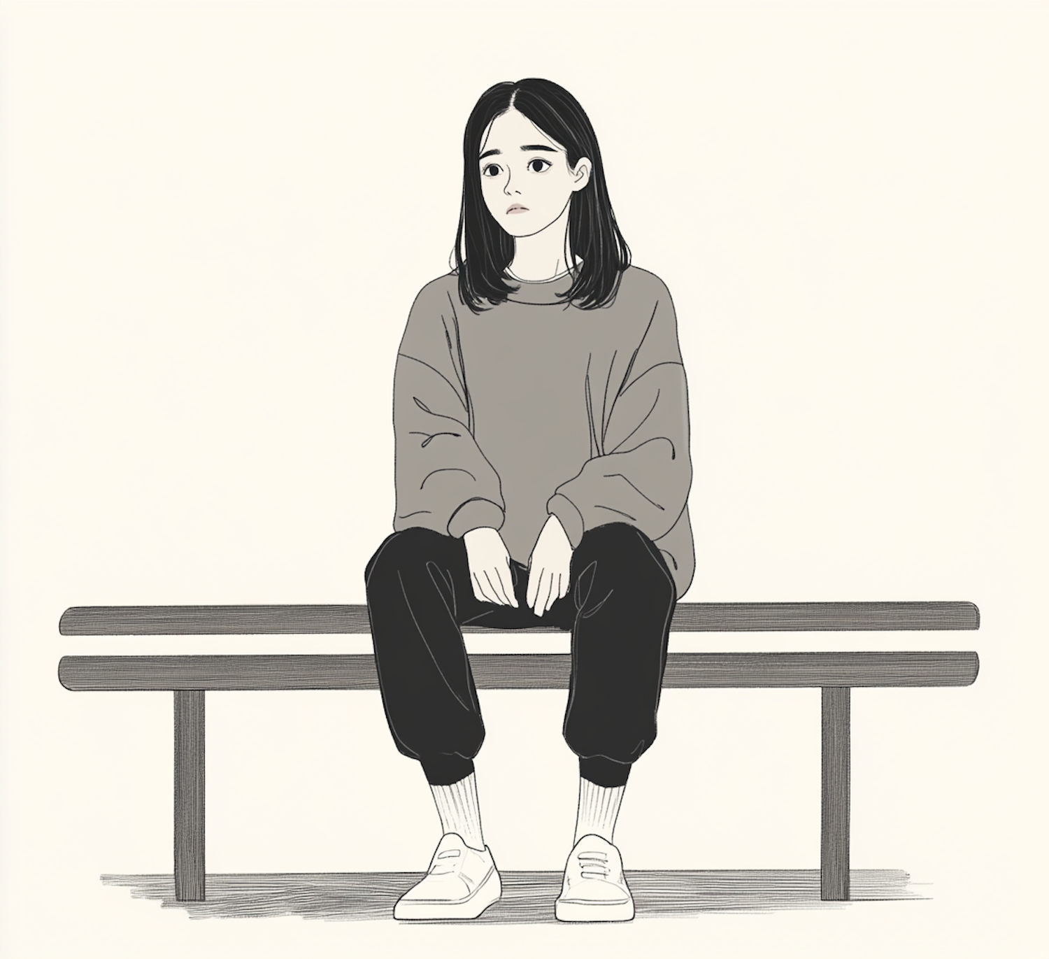 Monochrome illustration of a young woman sitting on a bench, wearing a sweater and sneakers, with a contemplative expression.
