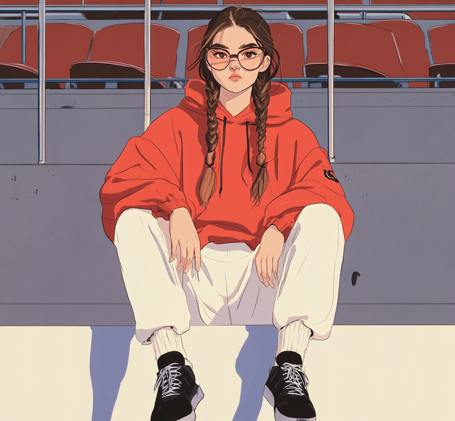 Illustration of a young woman in a red hoodie and glasses, sitting in a stadium with a confident expression.