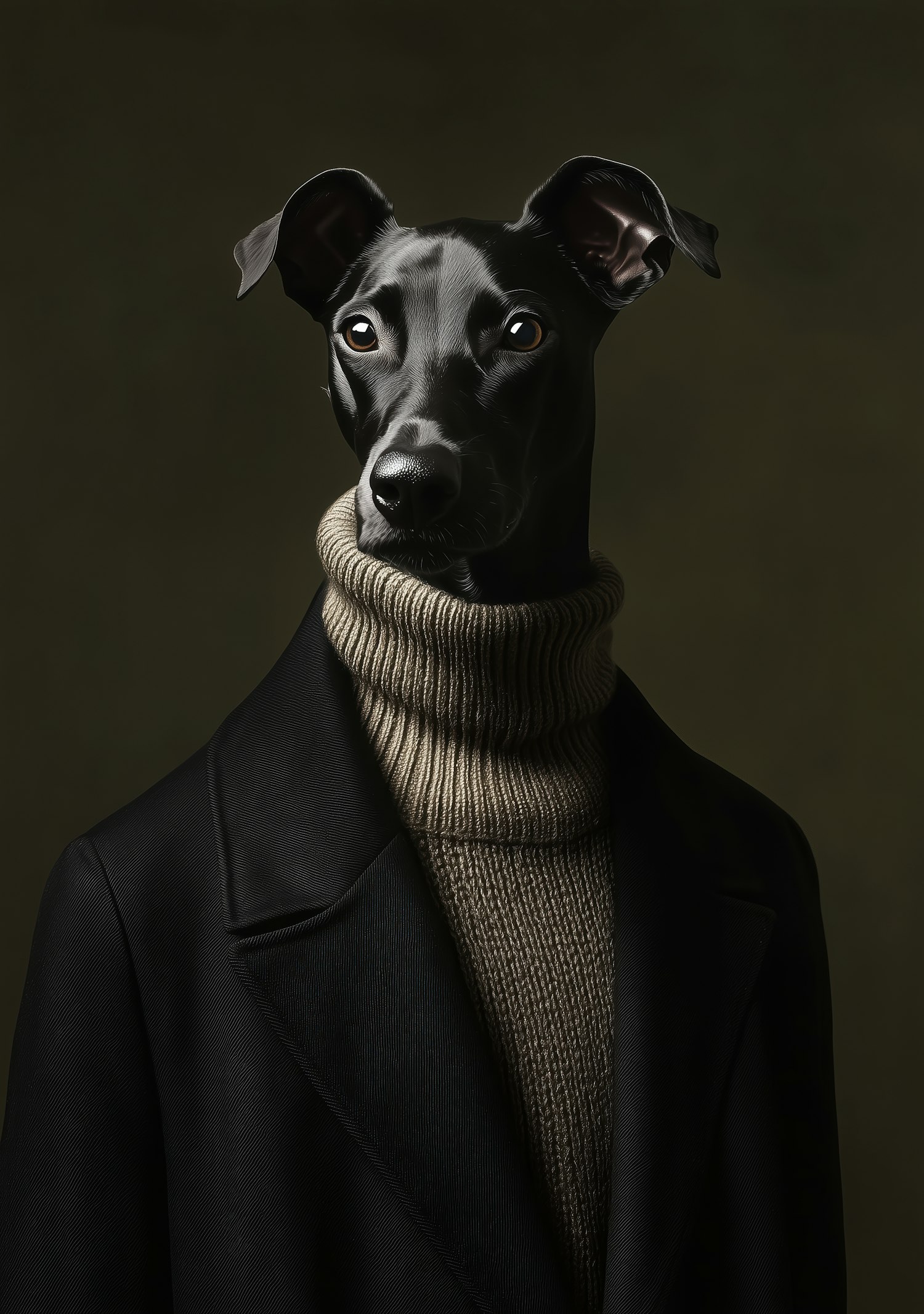 A stylish black dog in a coat and turtleneck, set against a dark green background, exudes elegance and sophistication.