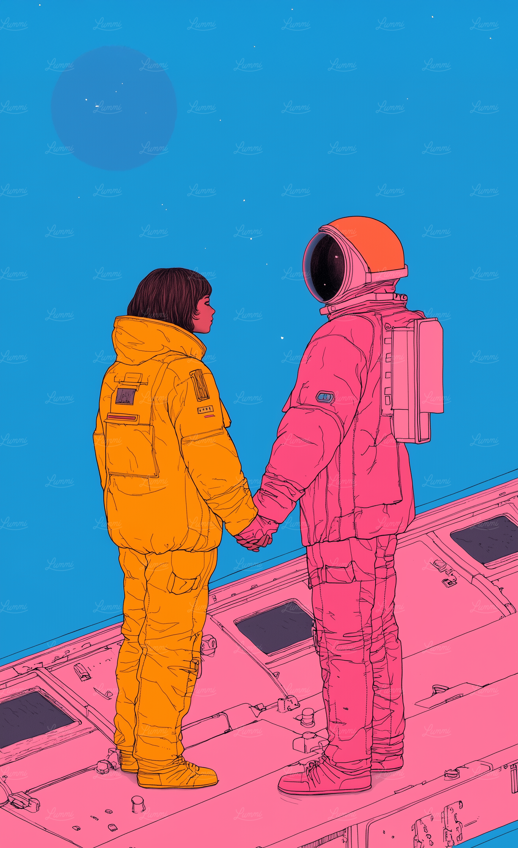 A colorful illustration of a woman and an astronaut holding hands on a spacecraft, set against a starry blue sky.