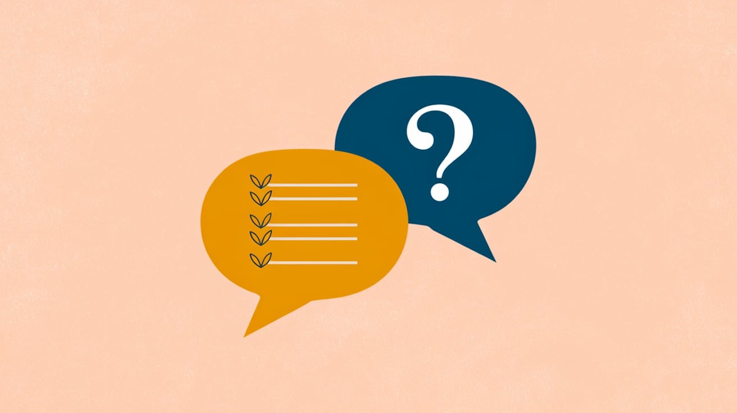 Minimalist illustration of two speech bubbles, one with a list icon and the other with a question mark, on a soft peach background.