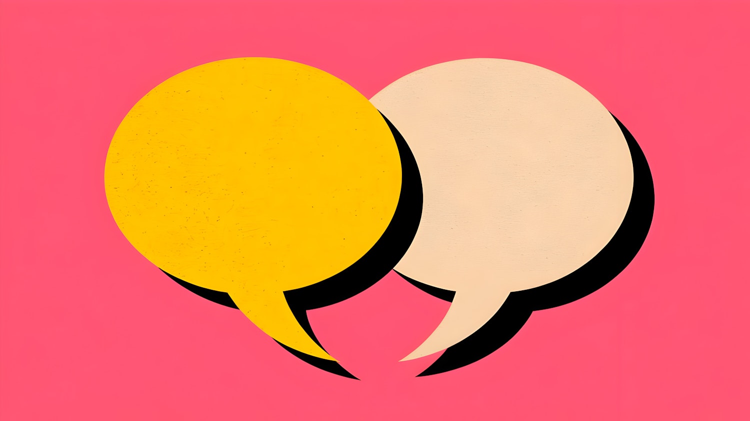 Bright yellow and beige speech bubbles overlap on a pink background, symbolizing communication and dialogue in a bold, minimalistic design.