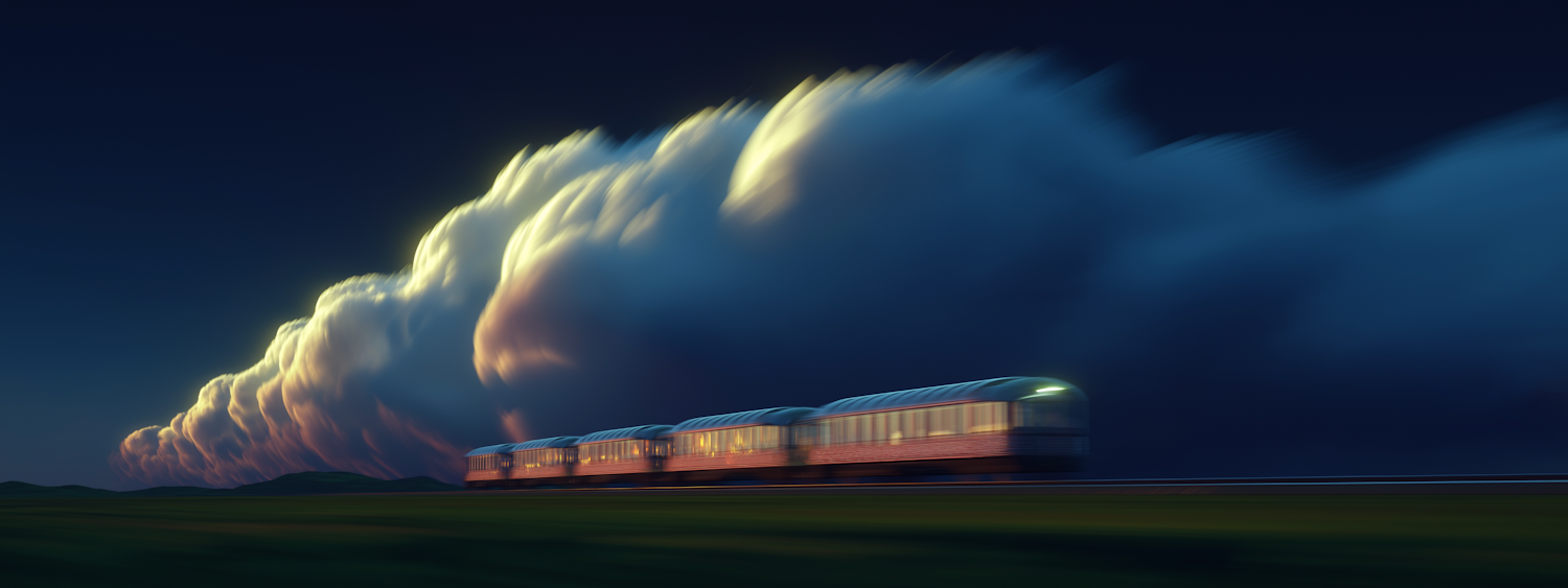 A train rushes through a serene landscape under a dramatic, illuminated cloud-filled evening sky, blending motion and tranquility.