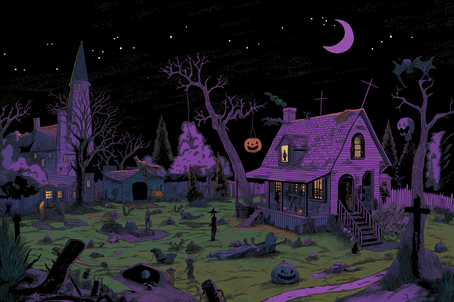 Spooky graveyard scene with a haunted house, crescent moon, and Halloween decorations. Perfect for a chilling Halloween vibe.
