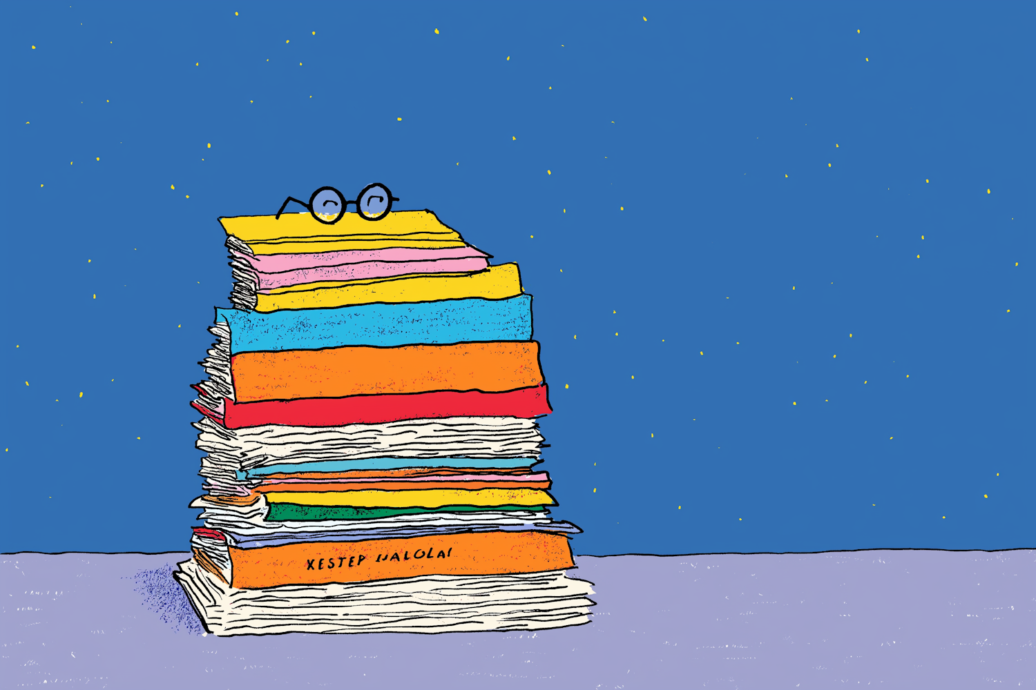 A colorful stack of books with glasses on top against a starry blue background, creating a whimsical and imaginative scene.