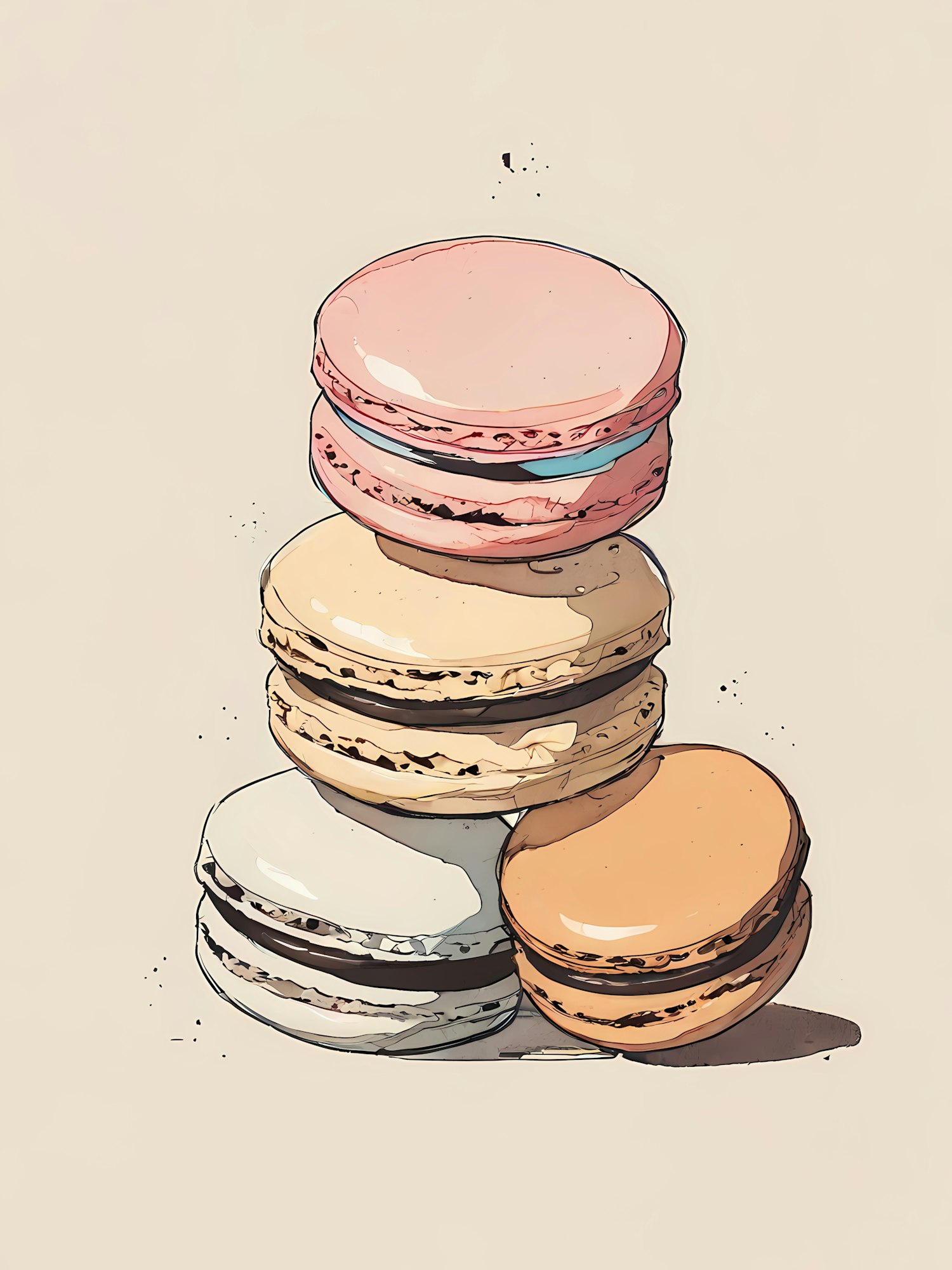 A stack of colorful macarons in a stylized illustration, featuring pink, beige, white, and orange hues on a light beige background.