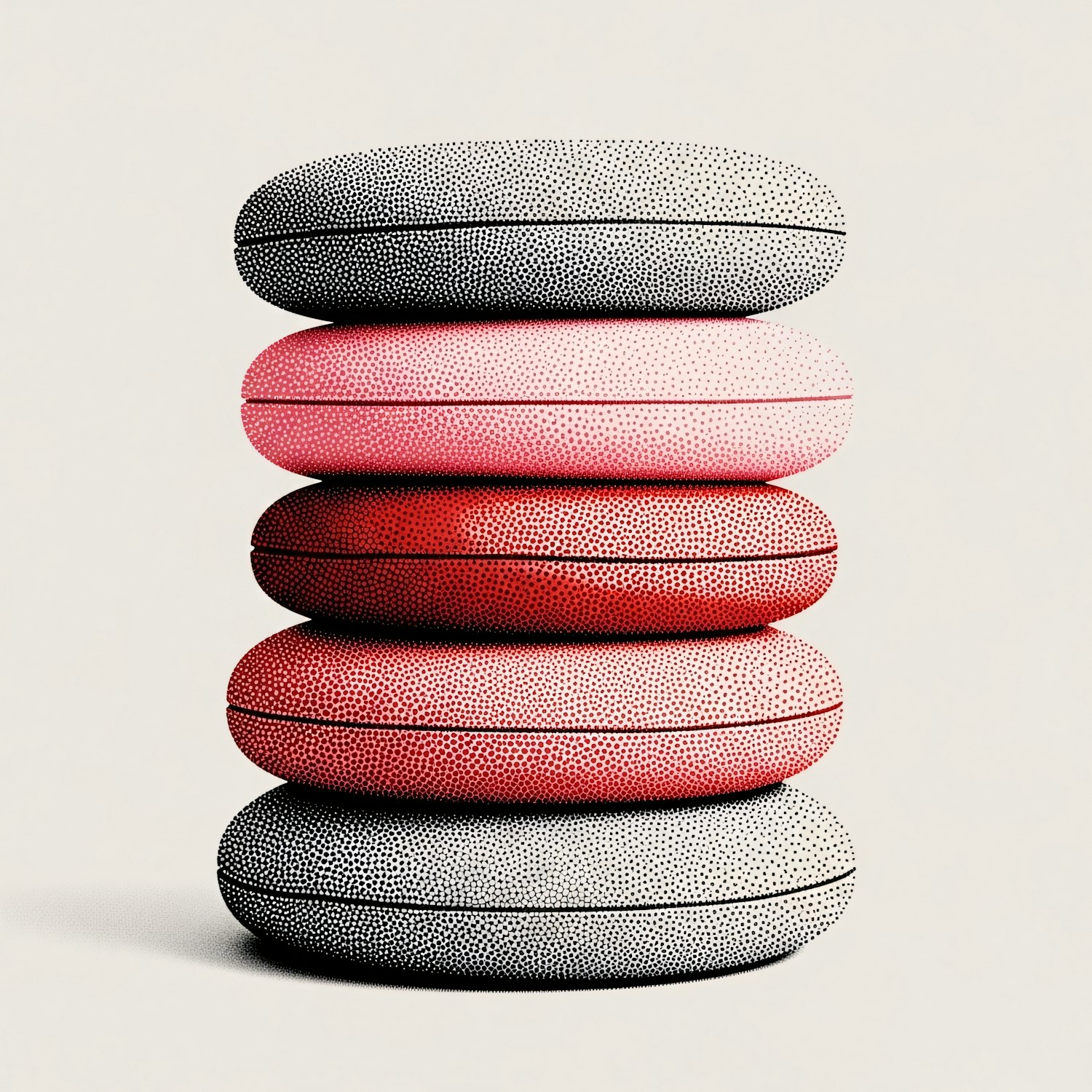 A stack of pink and gray textured cushions with a dotted pattern, arranged symmetrically against a neutral background.