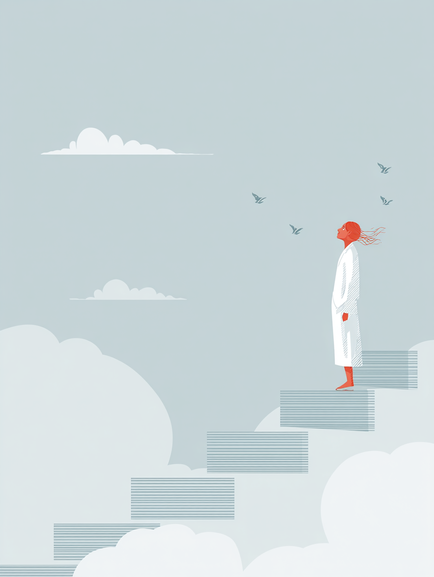 Minimalist illustration of a person on a staircase in the clouds, gazing upward. Soft blue sky, white clouds, and birds create a serene vibe.