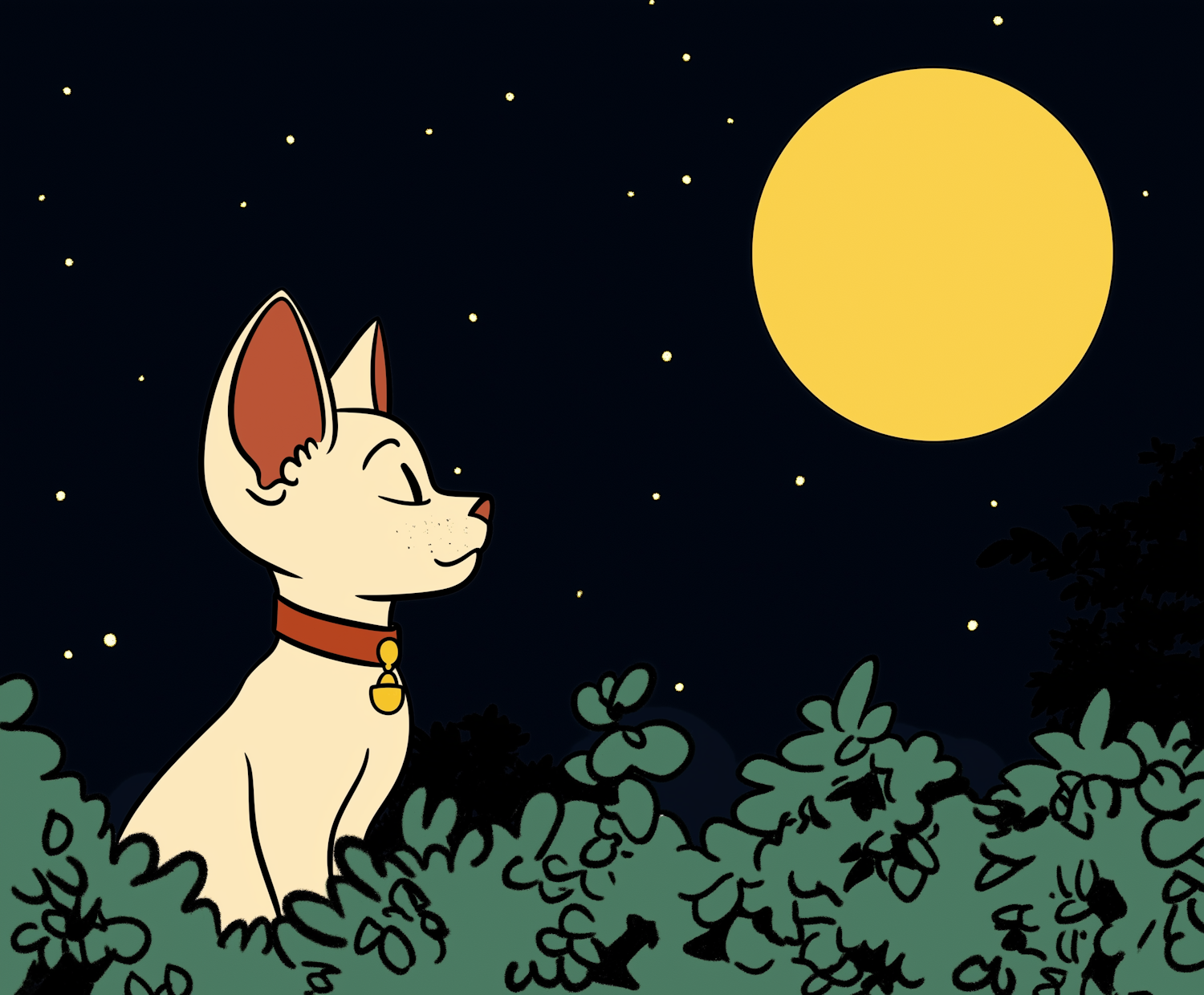 Cartoon cat with red collar sits in bushes under a bright yellow moon and starry night sky, creating a serene scene.